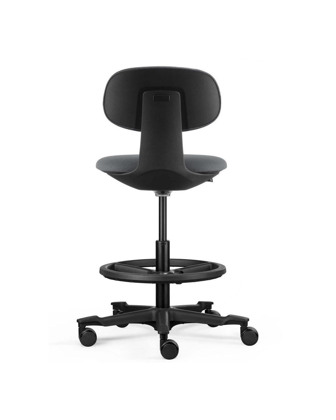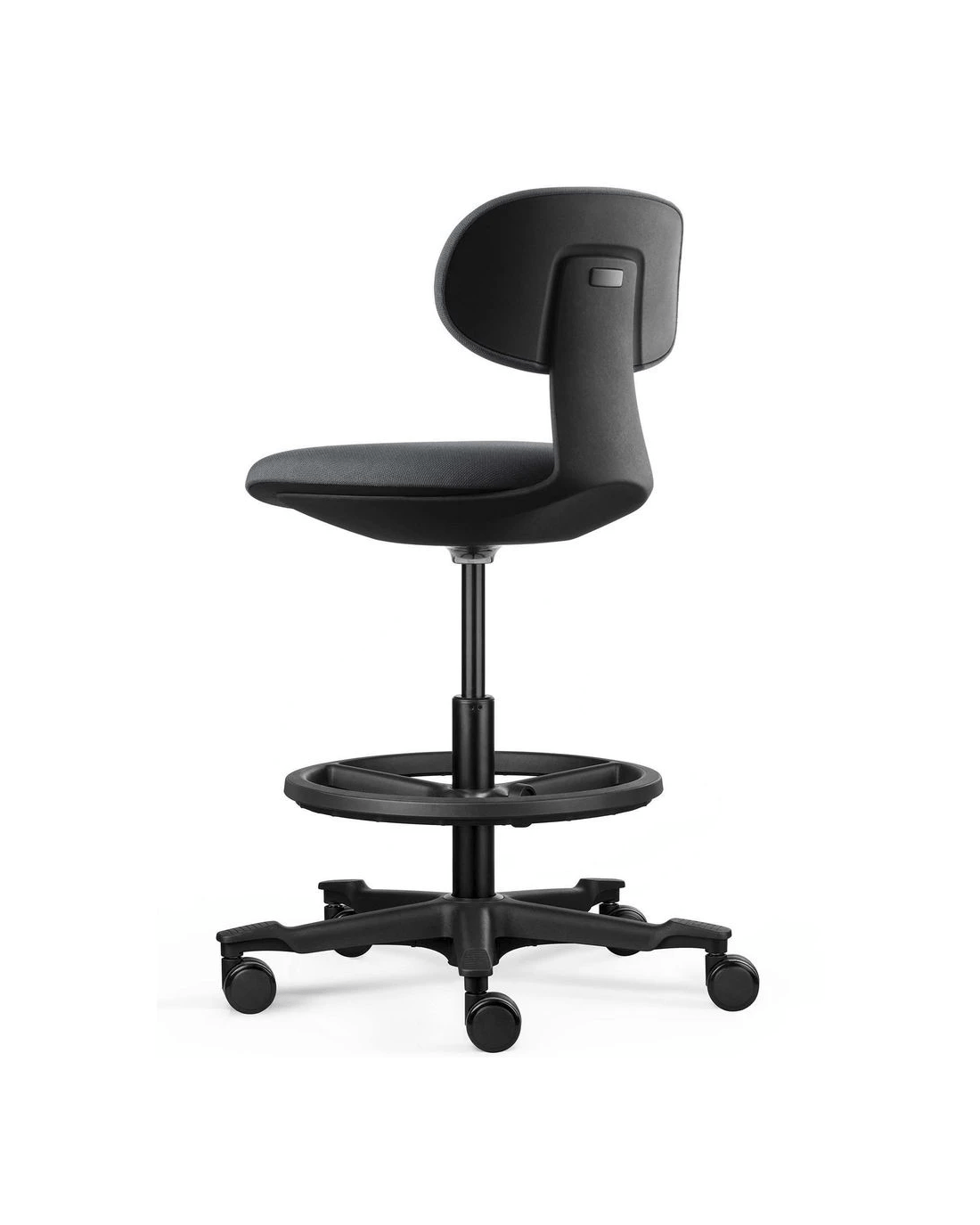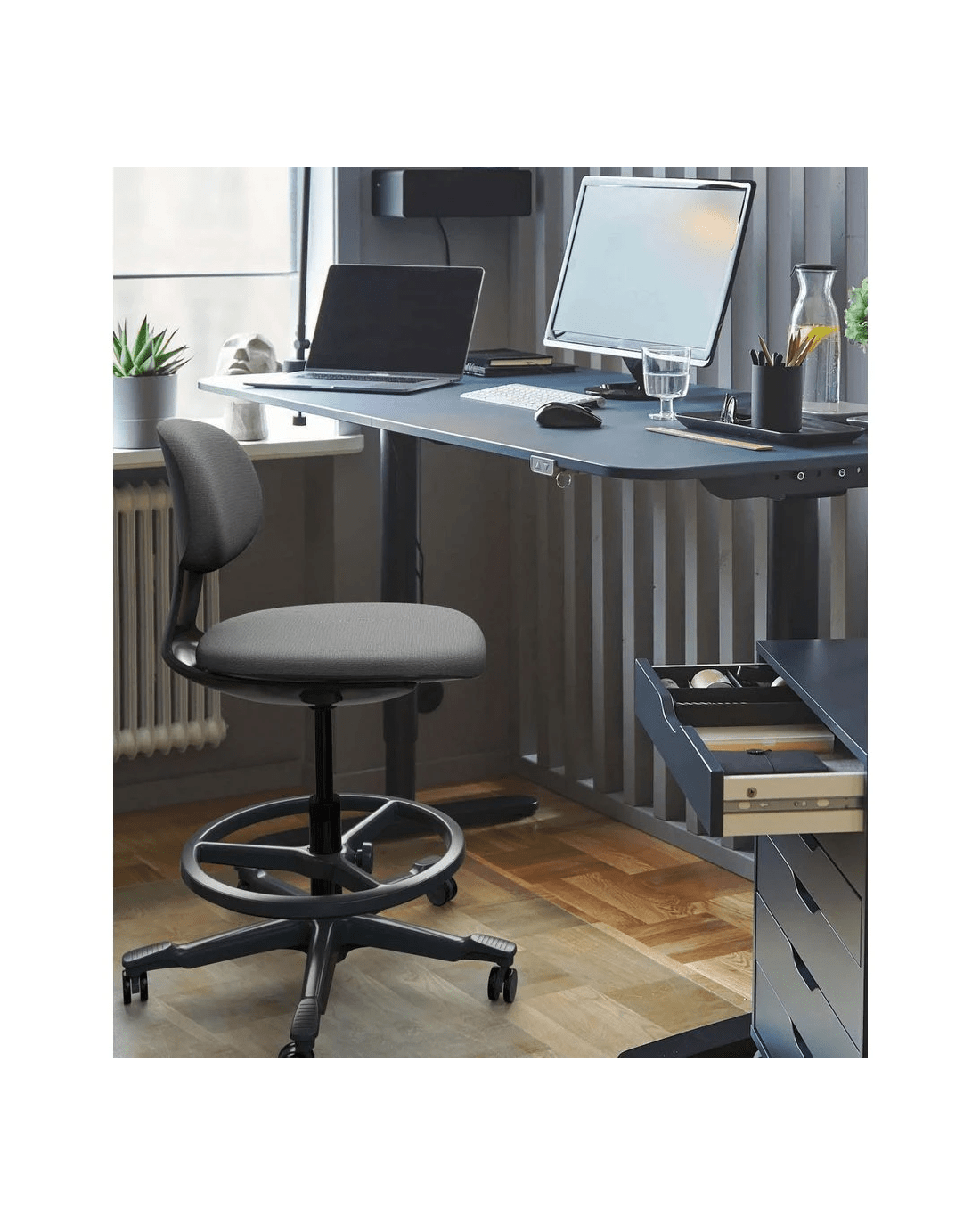 - The backrest and seat are covered in a dark grey fabric while the frame and nylon stool base are black.