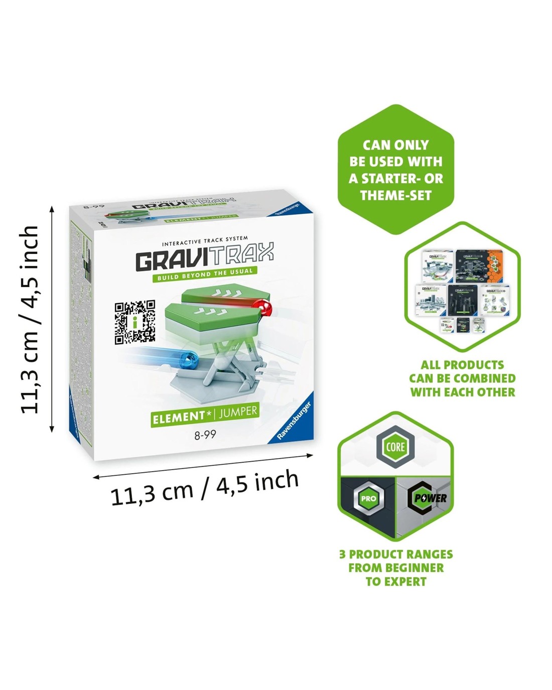 With the GraviTrax Jumper element, balls are transported to a higher level in breathtaking fashion and paths are split. The GraviTrax Jumper element lifts balls to new levels and creates new paths. In this way, height differences in the track can be overcome spectacularly. When a ball rolls into the jumper, it is spectacularly transported upwards and rolls on to a higher level. At the same time, a passage tunnel is created for the next balls. Combined with any GraviTrax starter set, the jumper element brings a whole new level of energy to the ball track. GraviTrax is a flexibly expandable, interactive marble run system: With GraviTrax, children, teenagers and adults don't just build simple marble runs. They create unique marble run worlds. By freely designing the marble runs and exploring the rolling behavior of the balls, the understanding of science is sharpened and gravity can be experienced at first hand. The GraviTrax universe includes three exciting lines - CORE, PRO and POWER. All GraviTrax lines and products can be freely combined with each other. The GraviTrax universe can be expanded infinitely with countless extensions with classic building elements or bricks that enable special action and tricks. So everyone can tinker, try things out and build beyond themselves. Ages 8 +