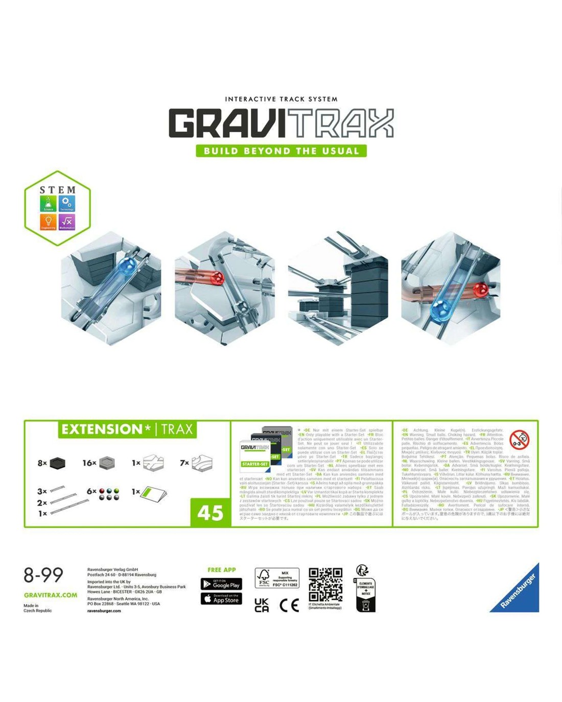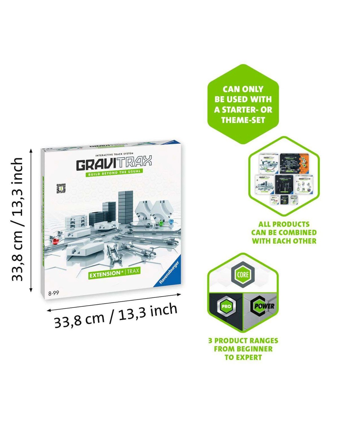 Experience the power of gravity! GraviTrax is the all Construction toy STEM track system from Ravensburger! Use your imagination to build superb tracks and set the gravity spheres rolling! This expansion pack includes over 40 components to extend the fun of your GraviTrax with even more tiles and tracks.This STEM system [Science, Technology, Engineering and Maths] is an ideal one to teach kids about gravity, magnetism, kinetic energy and fun. Hit a snag? Freestyle with your own track design or use the tasks and blueprints included to help you to get started in the world of GraviTrax! Are the gravity spheres stopping or flying off before reaching the end target? Time for some problem solving. Rebuild and try something different!The GraviTrax track system can be extended indefinitely with extra track packs and add-on's - each sold separately. Ages: 8 + | Players: 1 +