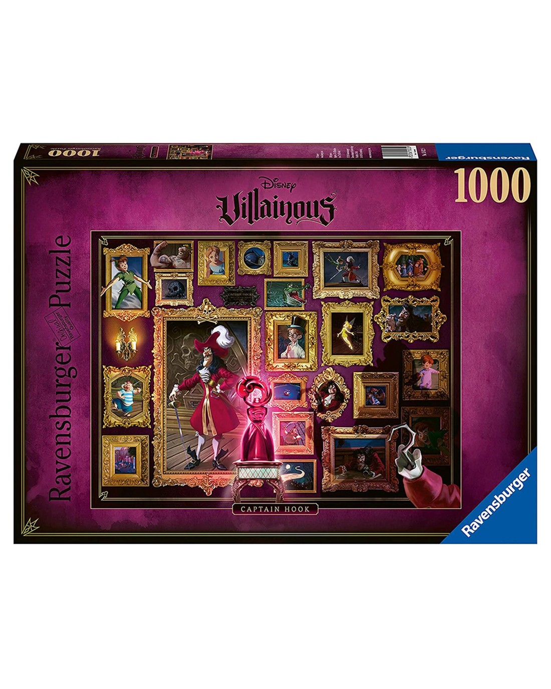Piece together this 1000-piece puzzle featuring Captain Hook, Neverland's most famous pirate and Peter Pan's arch nemesis. Assemble the puzzle to reveal Hook's most epic moments as well as iconic characters like Peter Pan, Mr. Smee, Tinker Bell and many more. All Villainous puzzles are based on the award winning family game ""Villainous"" by Ravensburger. Enjoy puzzling the magnificent realms of your favorite Disney Villains. Watch as the wicked ways, sinister spells, and devious deeds unfold as each piece is connected. Collect and build all six! Ages: 12 +