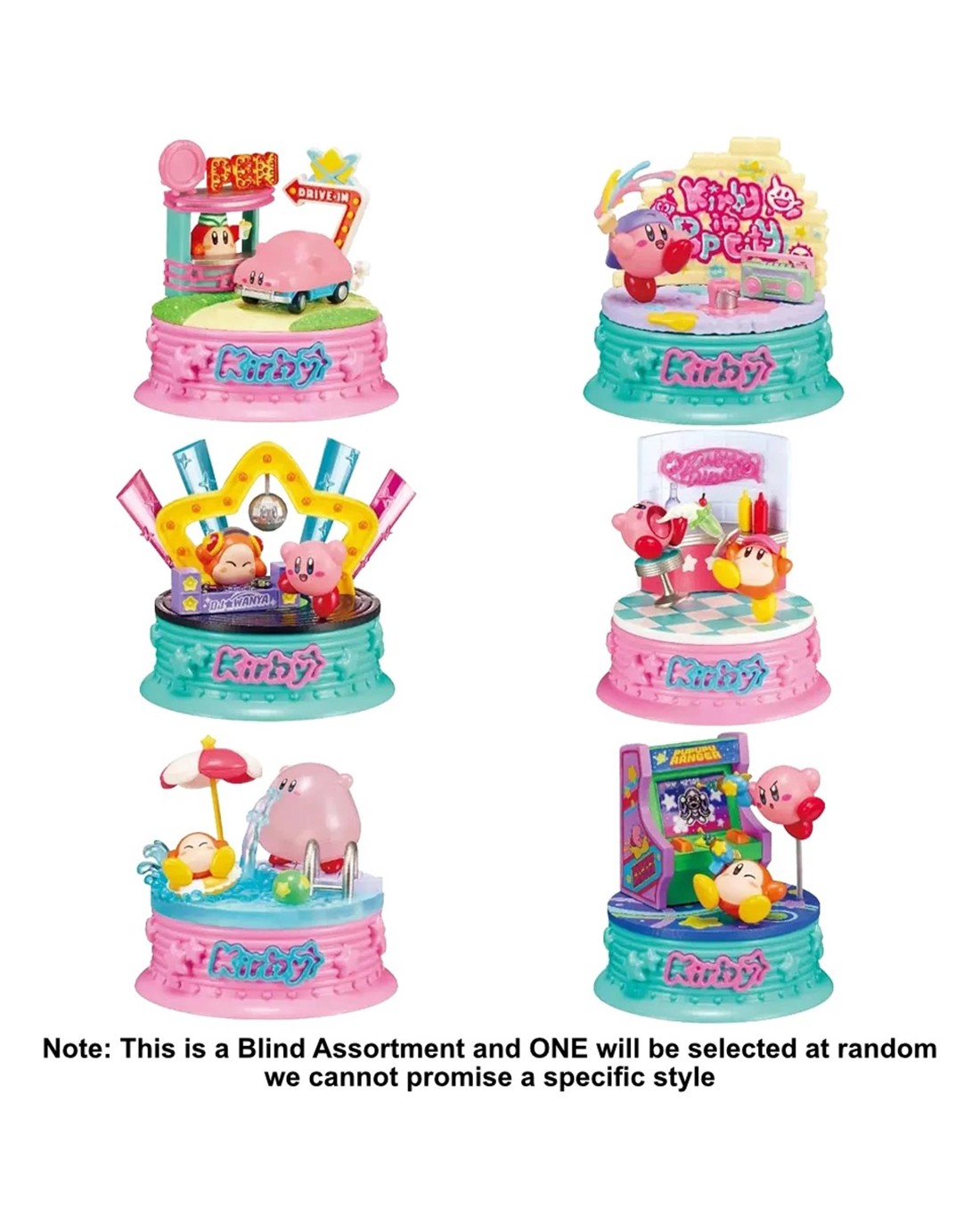 Kirby and Waddle Dee are having a great time in the fun, sparkly town of Pop City in this new series of display figures from Re-Ment! Each sweet little vignette is on its own stand, so they're easy to collect and display, and come in 6 variations: Perfect day for driving Party night fever Splash-tastic water fun Graffiti masterpiece Enjoy our special menu Aim for the high score Note: This is a blind box and are chosen at random, we cannot promise a specific style for online orders. Ages 15 +Contents