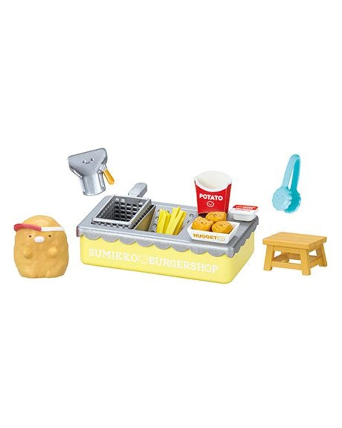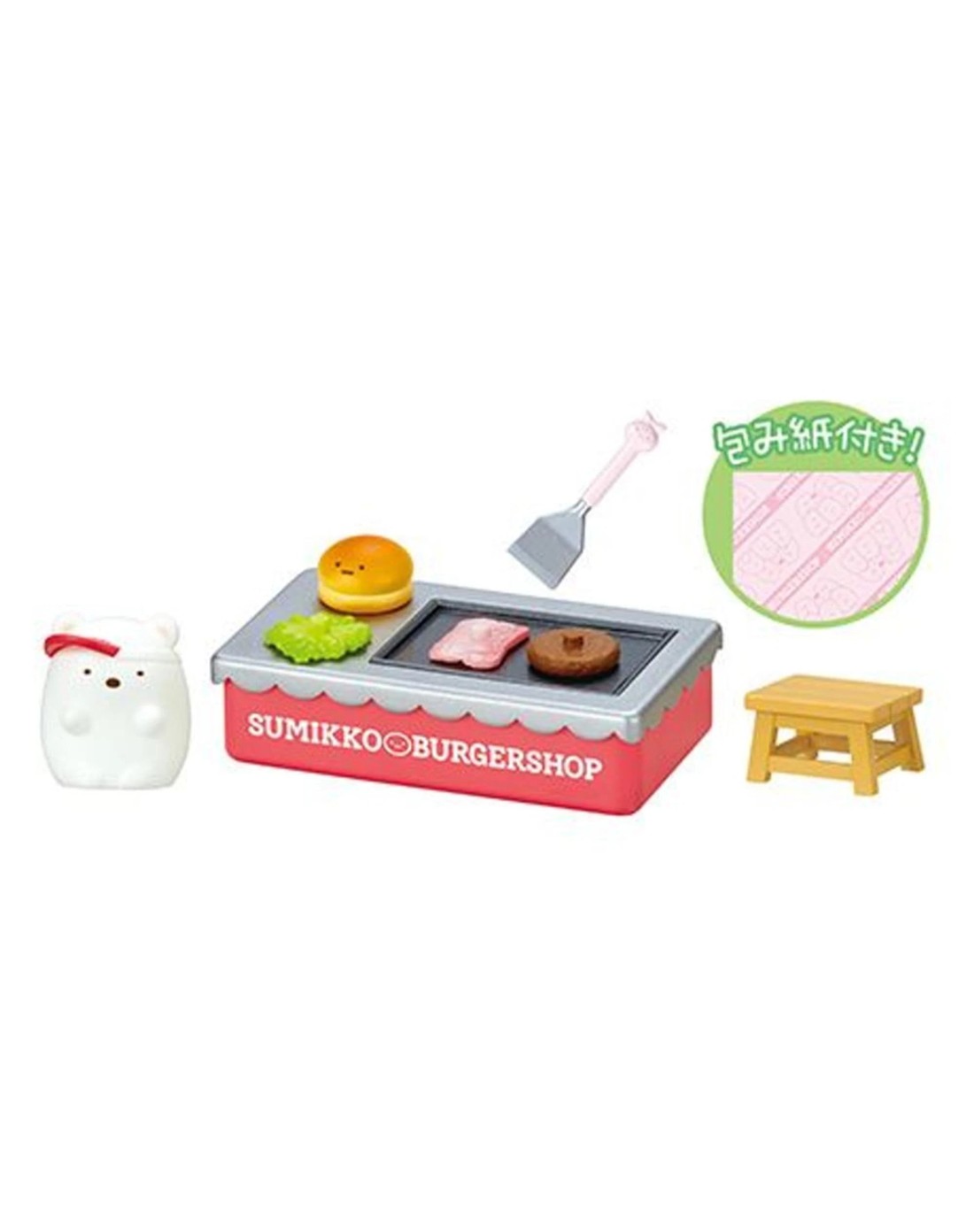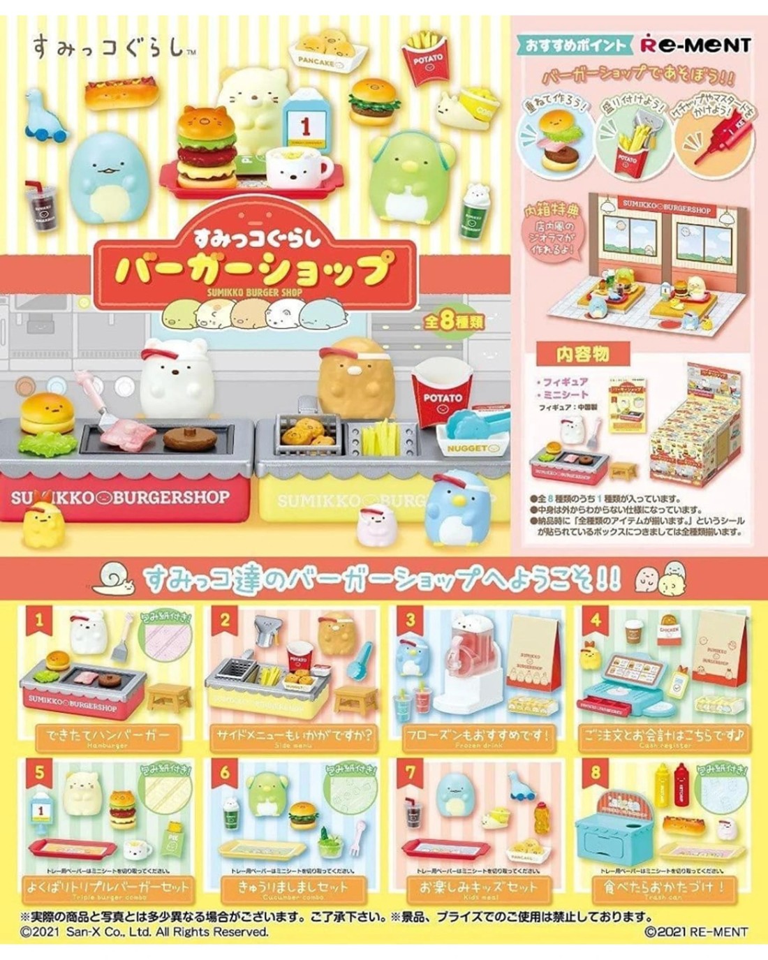 Step into the bustling world of Re-Ment's Sumikko Gurashi Burger Shop series. With 8 blind boxes to collect, you might uncover anything from a juicy 'Triple Burger Combo' to the neat 'Kid's Meal'. Each box is a mystery, featuring the quiet yet adorable Sumikko characters as part of the burger shop team or as hungry customers. Each mini scene can be displayed by itself or combined to a full burger shop and comes in 8 variations: Hamburger Side Menu Frozen Drink Cash Register Triple Buger Combo Cucumber Combo Kid's Meal Trash Can Collect them all! Note: This is a blind box and are chosen at random, we cannot promise a specific style for online orders. Ages 14 +Features