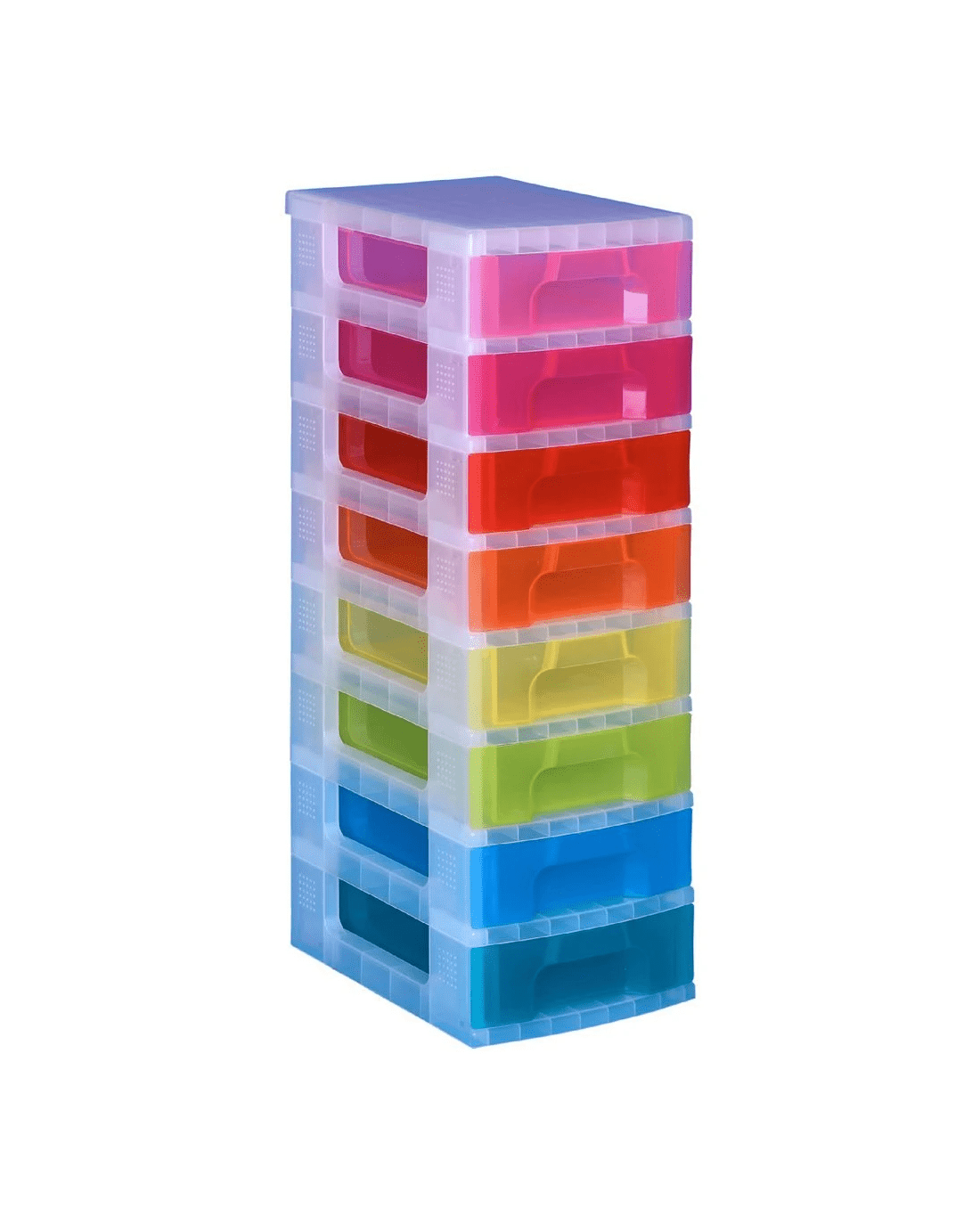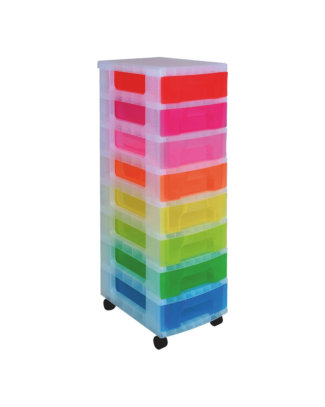 - The 8 colours of each drawers are hot pink, pink, red, orange, yellow, lime, light blue and blue.