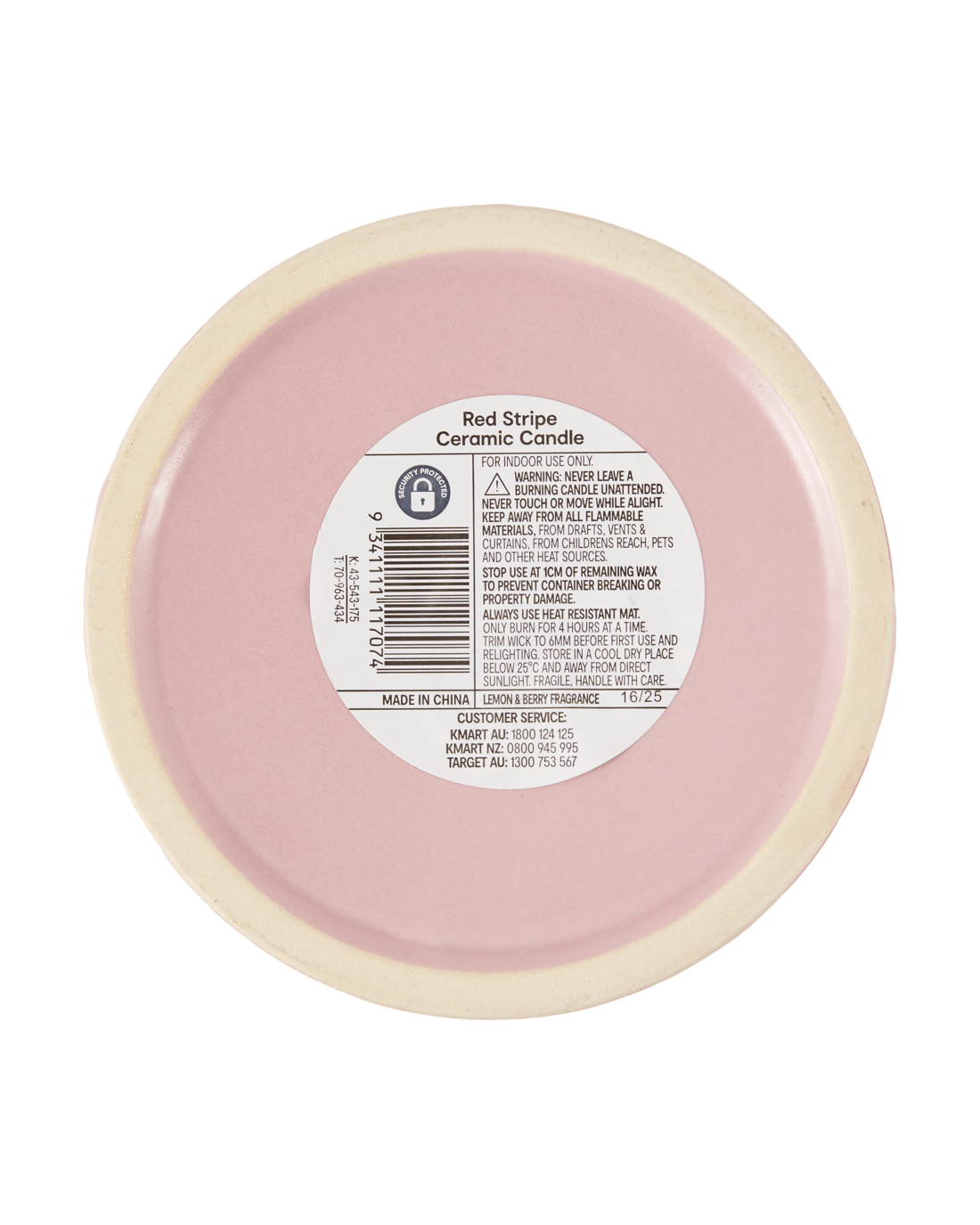 Brighten up your space with the Red Stripe Ceramic Candle. Housed in a vibrant striped jar, it combines zesty lemon and sweet berry fragrances for a refreshing scent. A cheerful addition to any room or setting.