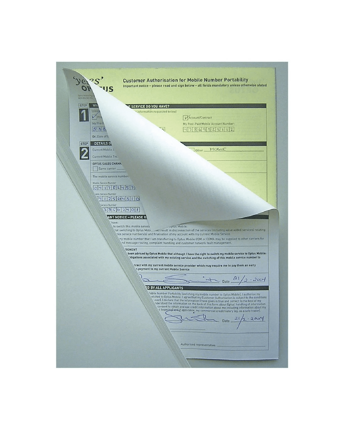 Rediform A4 Carbonless Paper is carbonless paper that is made up of 2 parts. The forms are pre collated with a white top copy and a yellow bottom copy, making it easy to distinguish between the original and copy sheets of paper. They are ideal for use in industries where information needs to be completed with a pen, such as sales contracts, invoices, delivery dockets, medical forms and more.