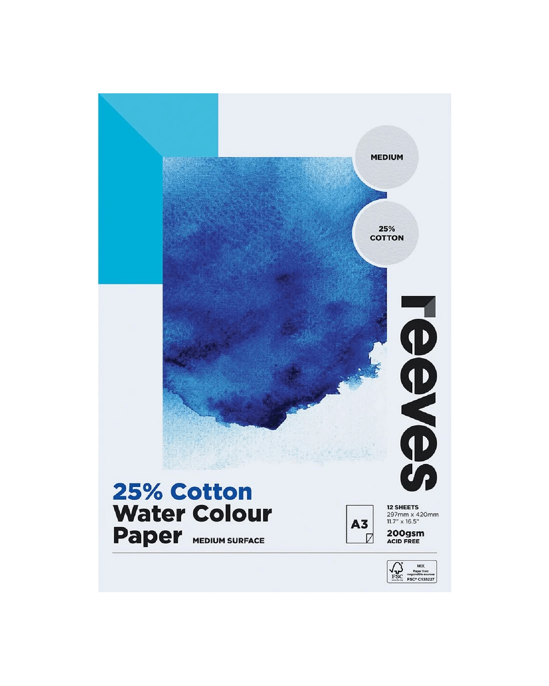 This Reeves Cotton Paper is suitable for use with watercolour paints, watercolour pencils, gouache and ink. It has a 25% cotton construction for added strength and durability when you're using wet materials.