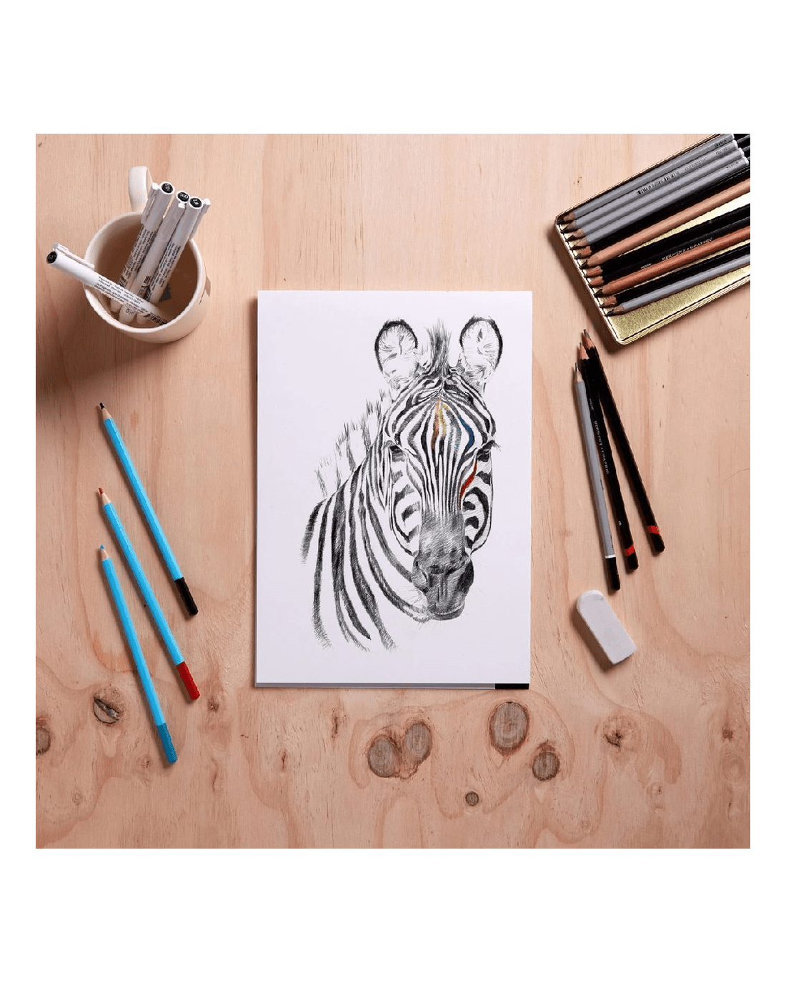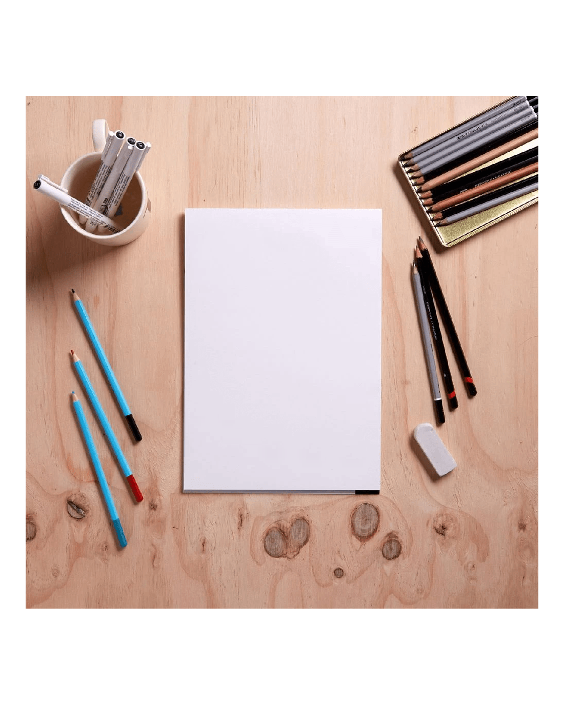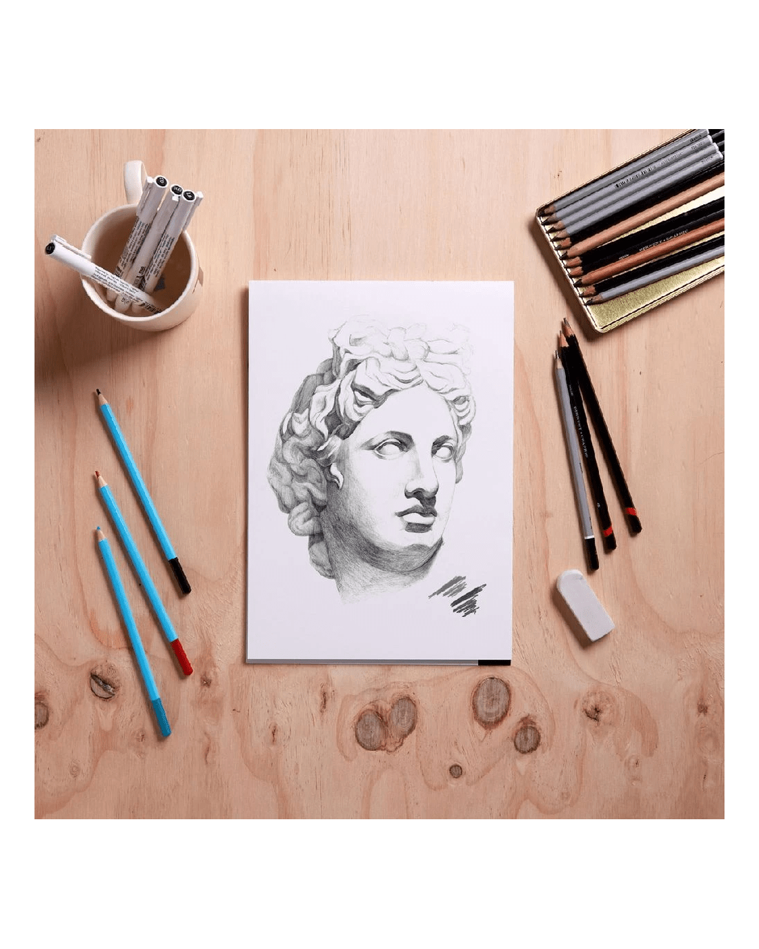 This Reeves Pad contains premium drawing paper ideal for everyday drawing and sketching. It's great for experimenting with pencils, pens, charcoal and graphite and its white surface ensures all dry media remains true to their original colour when used. The paper in this pad has a slight tooth, which easily grabs to media and allows for light shading techniques.