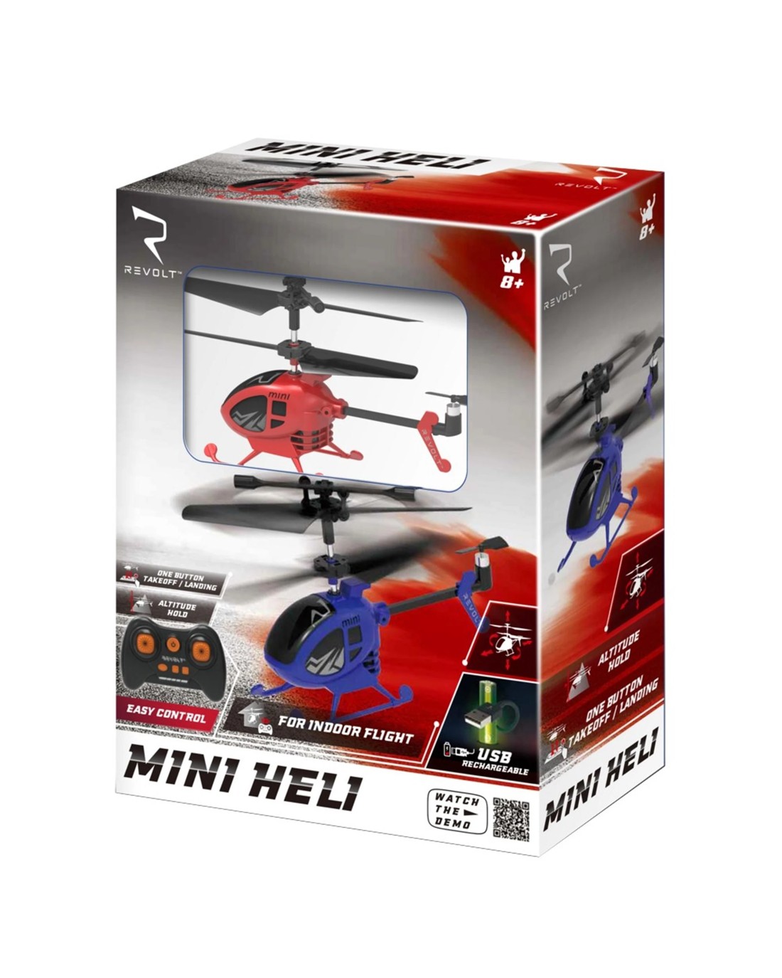 Manufacturer's DescriptionREVOLT Mini Heli measures just 10.4 x 6 x 2.54 cm (4.1" x 2.36" x 1") but it's packed with features typically found in larger remote-control helicopters. This 3.5 channel (2.4 GHz) mini helicopter offers exceptional agility and ease of flight with one-button take-off/landing and auto-hover. The REVOLT Mini Heli is extra tough and built to withstand crashes, making it great for first-time pilots to sharpen their flying skills. Intended for indoor use (or outdoors with little or no wind) Includes rechargeable Li-ion battery (3.7V/200 mAh), USB charging cable and replacement tail propeller. Remote control requires 4 AAA batteries (not included) Ages 8 +