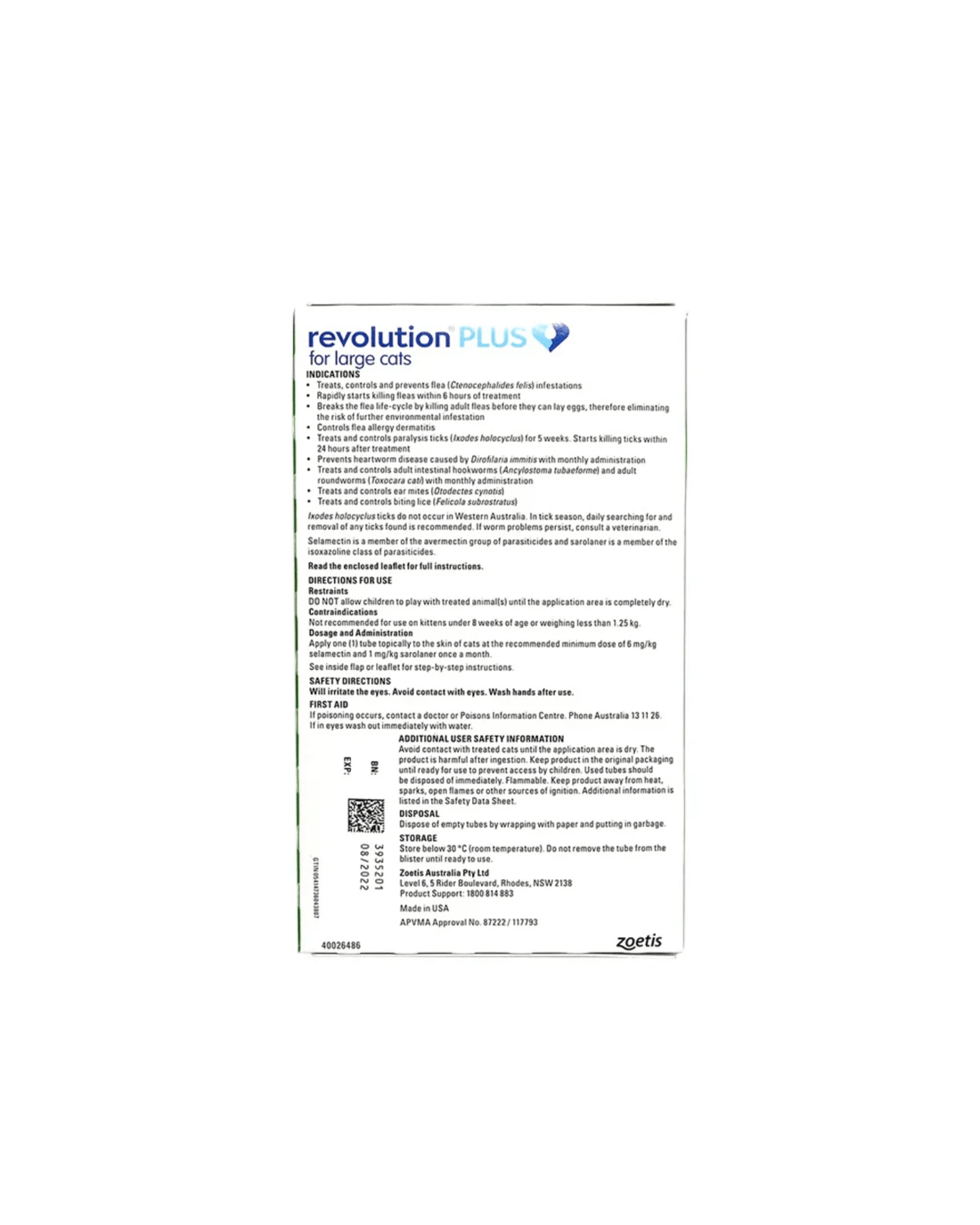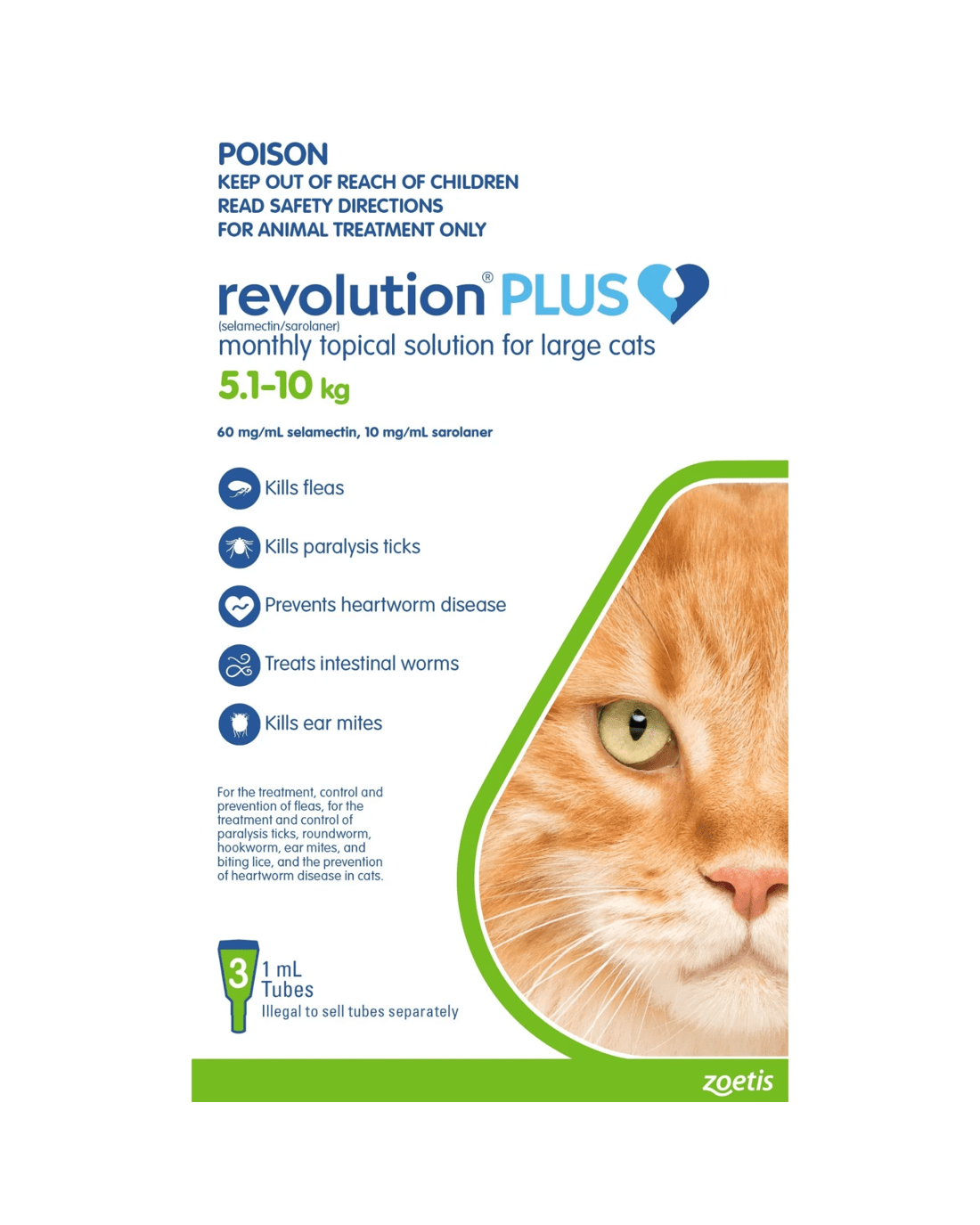Revolution Plus for cats is an easy-to-use monthly spot-on treatment that protects your pet from fleas, ticks, heartworm, intestinal worms, and ear mites. It kills adult fleas, eggs, and larvae to break the flea life cycle, keeping your cat protected for an entire month.