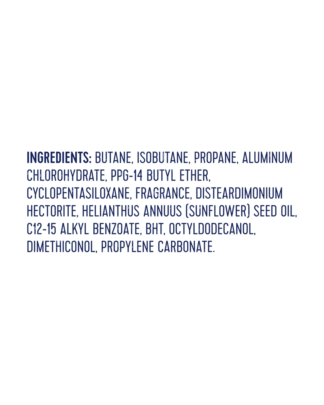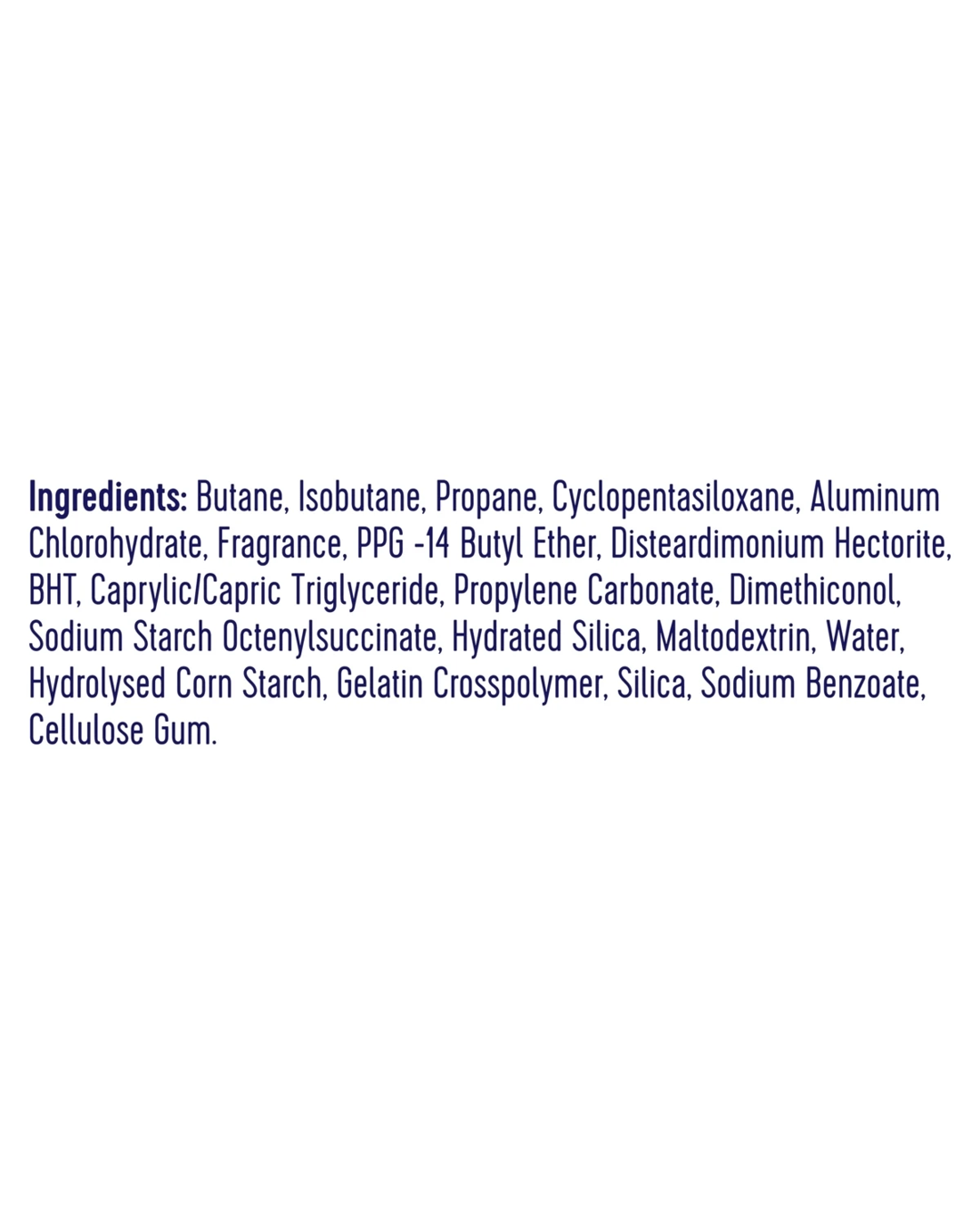 - Ingredients: Butane, Isobutane, Propane, Cyclopentasiloxane, Aluminum Chlorohydrate, Fragrance, Ppg-14 Butyl Ether, Disteardimonium Hectorite, Bht, Propylene Carbonate, Dimethiconol, Caprylic/Capric Triglyceride, Hydrated Silica, Gelatin Crosspolymer, Water, Cellulose Gum, Sodium Benzoate, Sodium Starch Octenylsuccinate, Maltodextrin, Hydrolysed Corn Starch, Silica