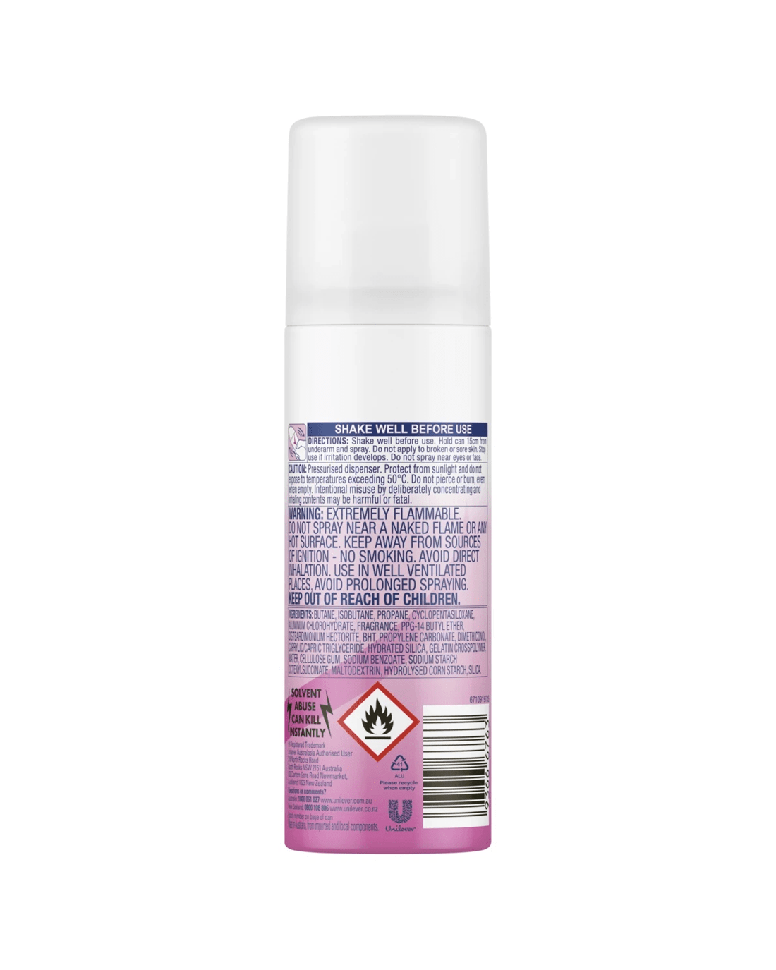 • Ingredients: Butane, Isobutane, Propane, Aluminum Chlorohydrate, Cyclopentasiloxane, Ppg-14 Butyl Ether, Fragrance, Disteardimonium Hectorite, Carpylic/Capric Triglyceride, Bht, Hydrated Silica, Gelatin Crosspolymer, Maltodextrin, Sodium Starch Octenylsuccinate, Hydrolysed Corn Starch, Cellulose Gum, Sodium Benzoate, Water, Propylene Carbonate, Silica.