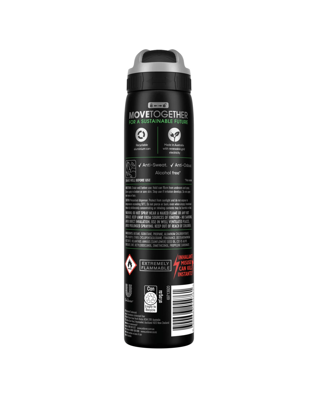 Rexona Men Quantum Antiperspirant Deodorant provides 48 hours of sweat and odour protection ? giving you the confidence to start moving and take on the day. Our aerosol deodorant features an alcohol-free*, anti-sweat and anti-odour formula that delivers long-lasting protection. Blending citrusy, spicy and woody notes, it?ll make you feel fresh, dry and clean all day long ? so you?re ready for whatever comes your way. To use, shake well and spray 15 cm away from underarms, then you?re good to go. As part of our efforts to move together for a sustainable future, we?re increasing our use of reusable materials and making it easier for you to recycle our packaging. Our deodorant spray is made in Australia with renewable grid electricity and comes in a recyclable aluminium can ? please recycle when empty. Rexona was created in Australia more than 100 years ago, so it?s fair to say we know a thing or two about sweat and odour protection. Rexona deodorants give you the confidence to move more and go further by giving you all the support and protection you need to reach beyond your limits. When you work hard, Rexona works harder. Rexona ? it won?t let you down.