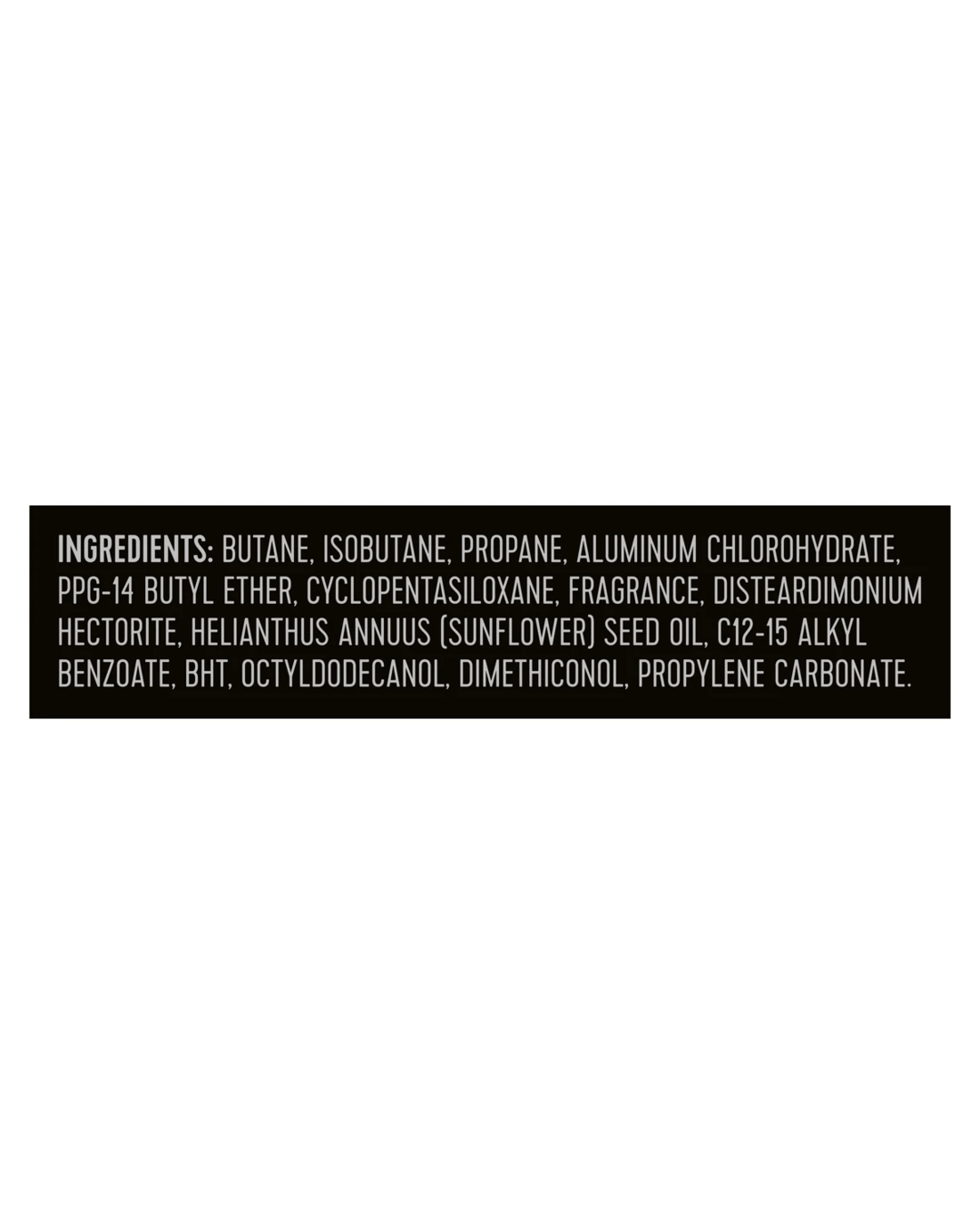 - Ingredients: Butane, Isobutane, Propane, Aluminum Chlorohydrate, Cyclopentasiloxane, Ppg-14 Butyl Ether, Fragrance, Disteardimonium Hectorite, Caprylic/Capric Triglyceride, Bht, Hydrated Silica, Gelatin Crosspolymer, Maltodextrin, Sodium Starch Octenylsuccinate, Hydrolysed Corn Starch, Cellulose Gum, Sodium Benzoate, Water, Propylene Carbonate, Silica