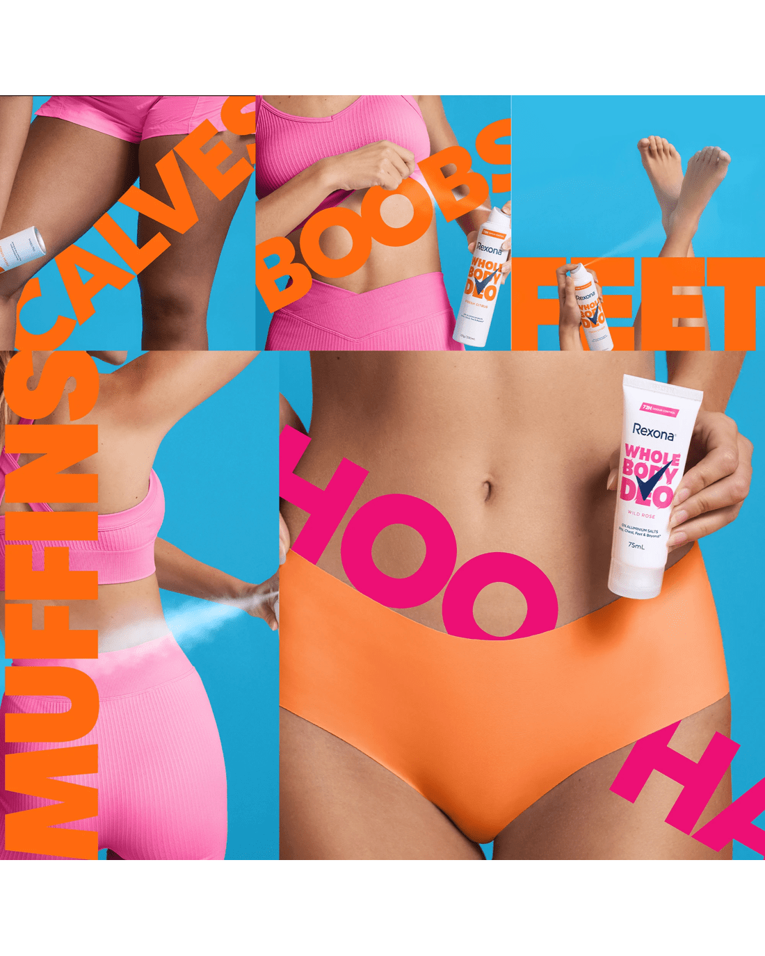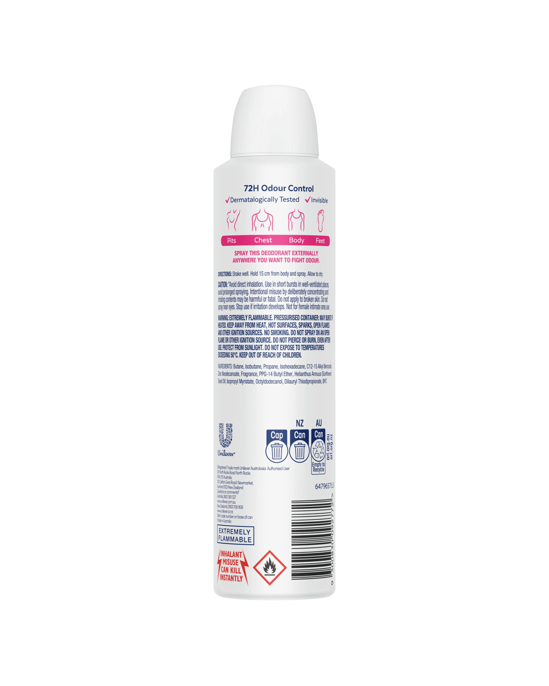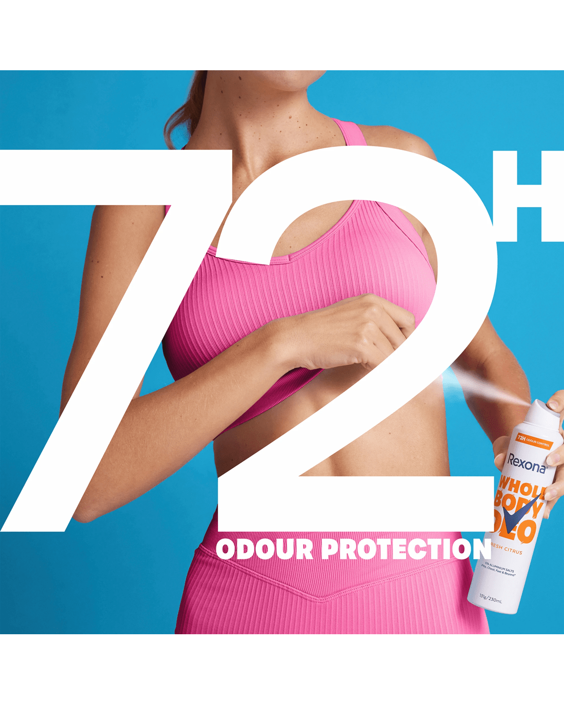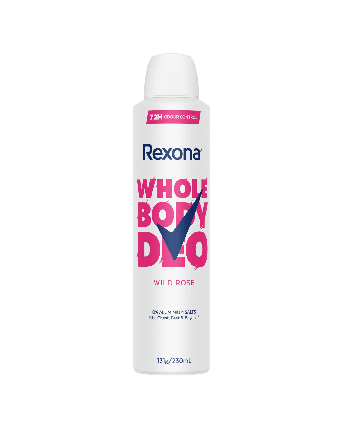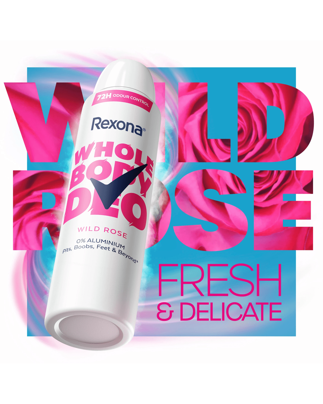 Stay fresh all over with Rexona Wild Rose Whole Body Deodorant. This aluminium-free deodorant for women provides 72 hours of odour control so you can overcome your limits. Our whole body deodorant features Rexona's patented Body Adapt Technology, which stops odour before it even starts. This woman's deodorant spray offers a fresh and floral fragrance with a classic, feminine feel. Its quick-drying formula leaves less residue and feels light and refreshing on the skin, providing nearly instant freshness. Use it wherever you need to control odour all over - including your pits, chest, feet and beyond, but excluding your face. Avoid contact with eyes and broken skin. Stop use if rash or irritation occurs. Every part of your body has a unique microbiome, which causes body odour to vary across different areas. Only Rexona Whole Body Deodorant adapts to you - wherever you need it - so you can overcome your limits. Our whole body deodorant sprays work over a large surface area, making them a convenient choice. At Rexona, we want to inspire confidence in everyone to move more and go further. We're here to support your journey with an aluminium-free deodorant spray that keeps you fresh all over. Rexona. It won't let you down.