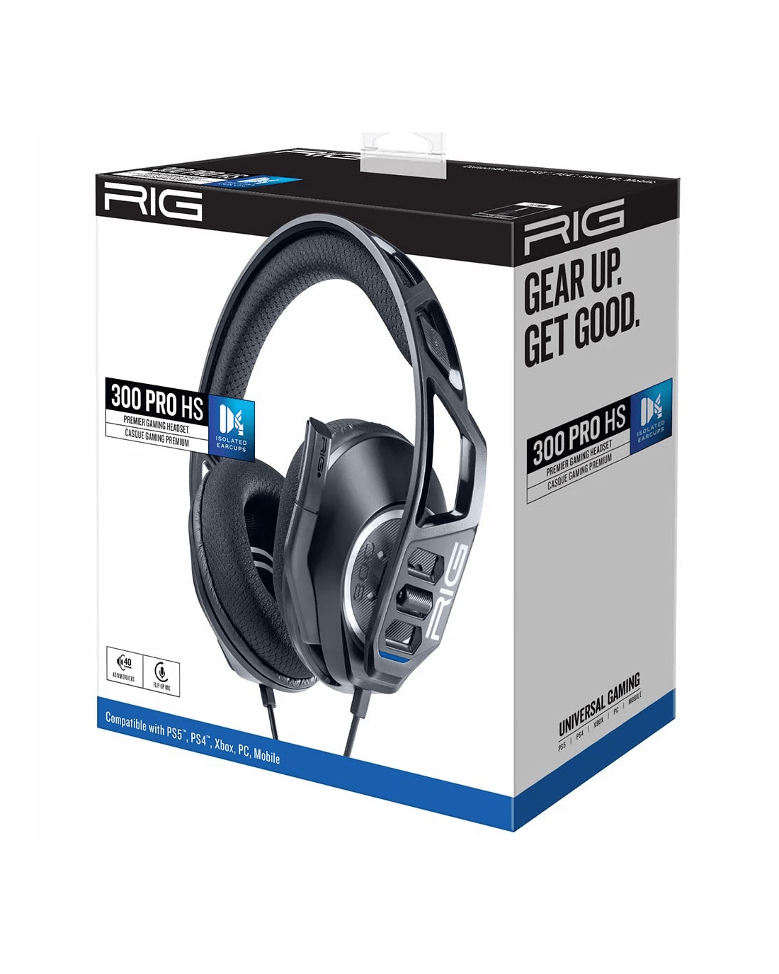 Play better for longer with the uncompromising performance of RIG 300 PRO HS, designed for PlayStation(R)4 and PlayStation(R)5. Oversized, noise-isolating earcups encompass precision tuned 40MM drivers that deliver rich bass and accurate highs. An ultralight flexible and durable headband is coupled with fabric-covered ear cushions that provide enduring comfort. Chat microphone flips up for convenient storage or travel.