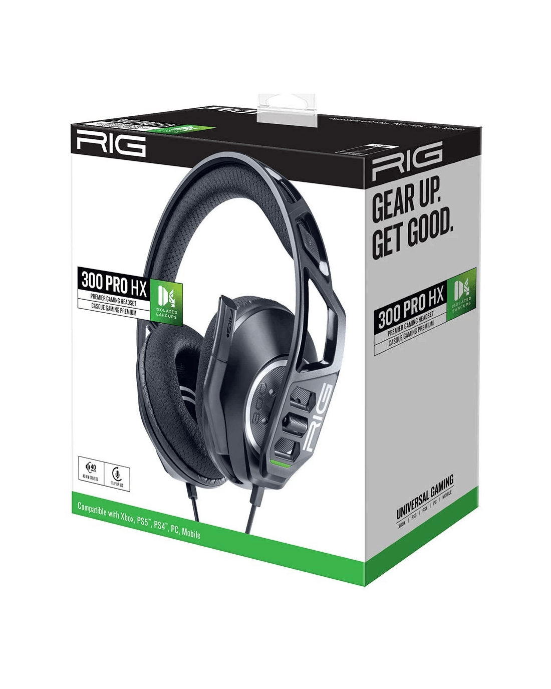 Play better for longer with the uncompromising performance of RIG 300 PRO HX, designed for Xbox. Oversized, noise-isolating earcups encompass precision tuned 40MM drivers that deliver rich bass and accurate highs. An ultralight flexible and durable headband is coupled with fabric-covered ear cushions that provide enduring comfort. Chat microphone flips up for convenient storage or travel.