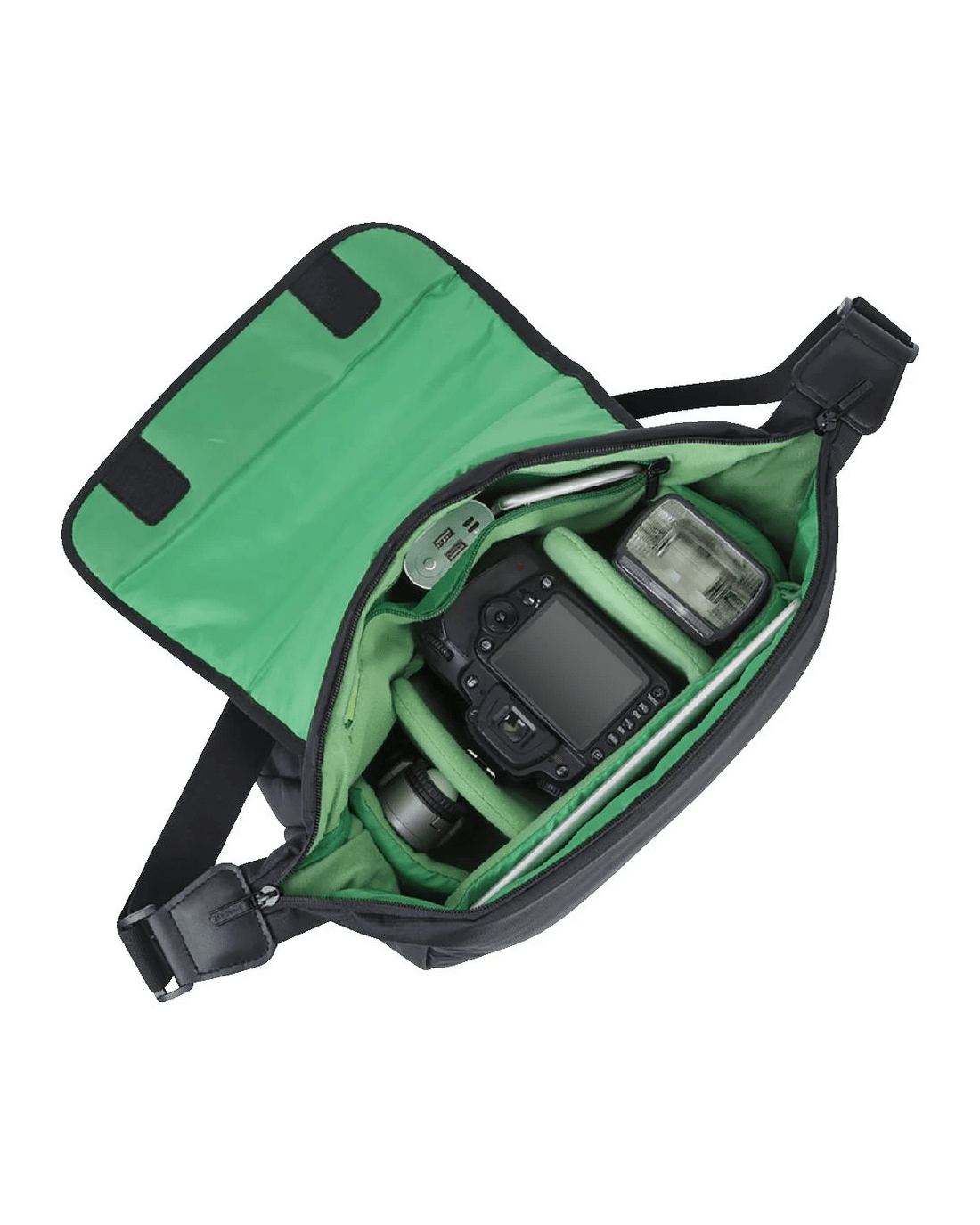 - Its main compartment is designed to fit your DSLR camera and lenses, and it also has a compartment for your tablet.