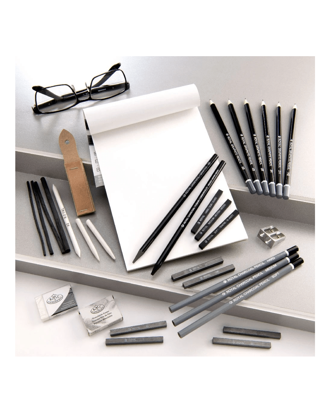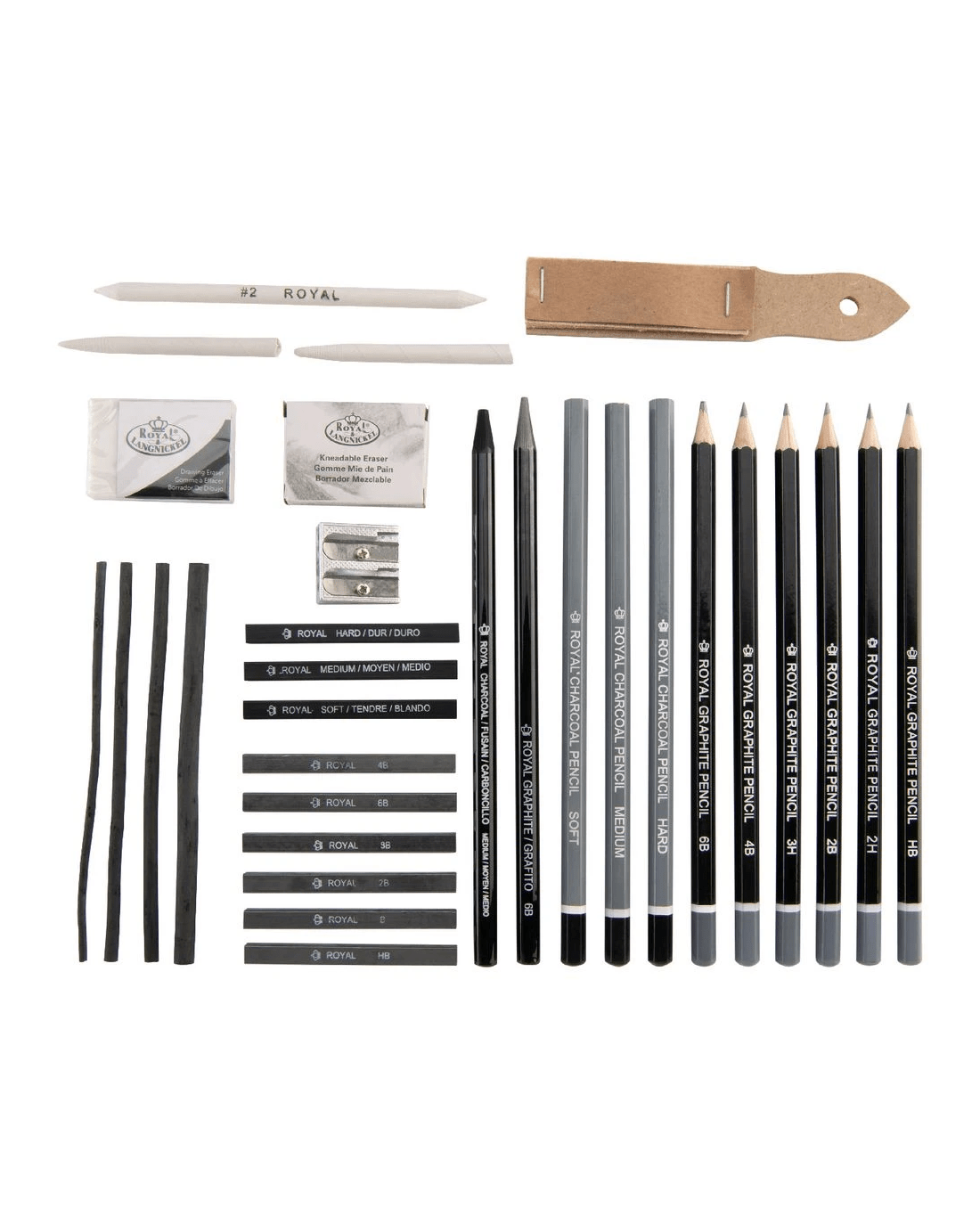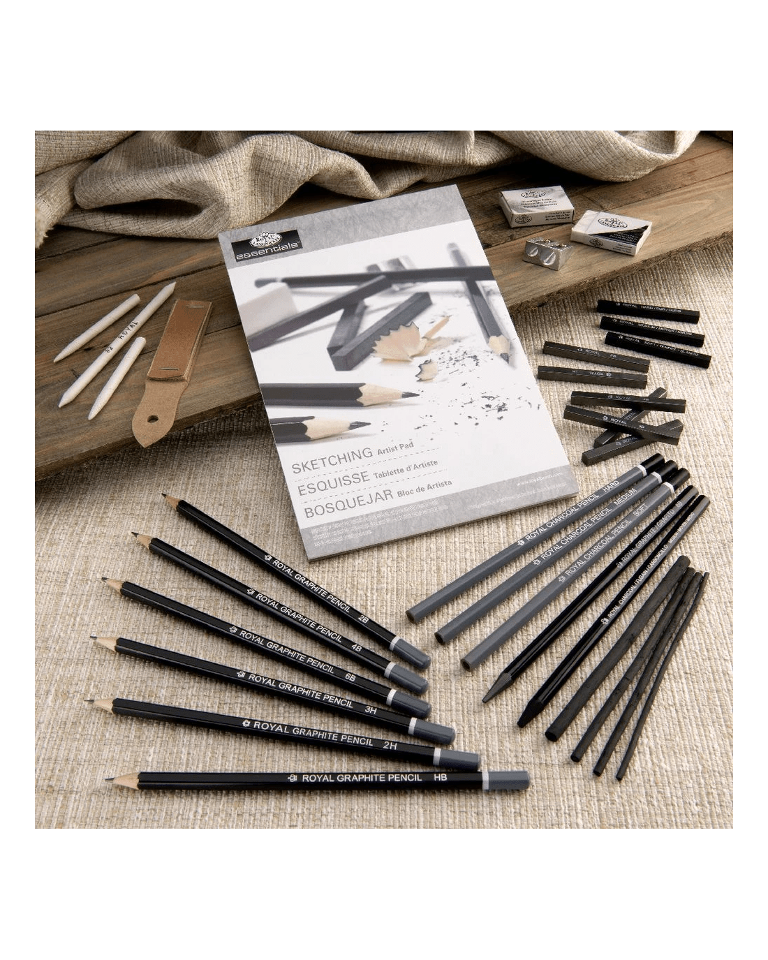 - This set includes 6 graphite pencils, 6 sketching sticks, 4 vine charcoals, 3 charcoal pencils, 3 charcoal sticks, 3 blending stumps, a kneadable eraser, a white eraser, a sharpener, a sanding block and a sketching pad.