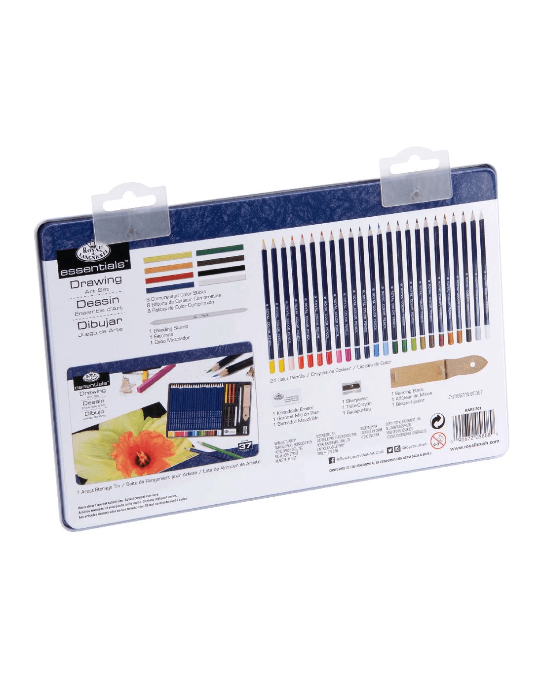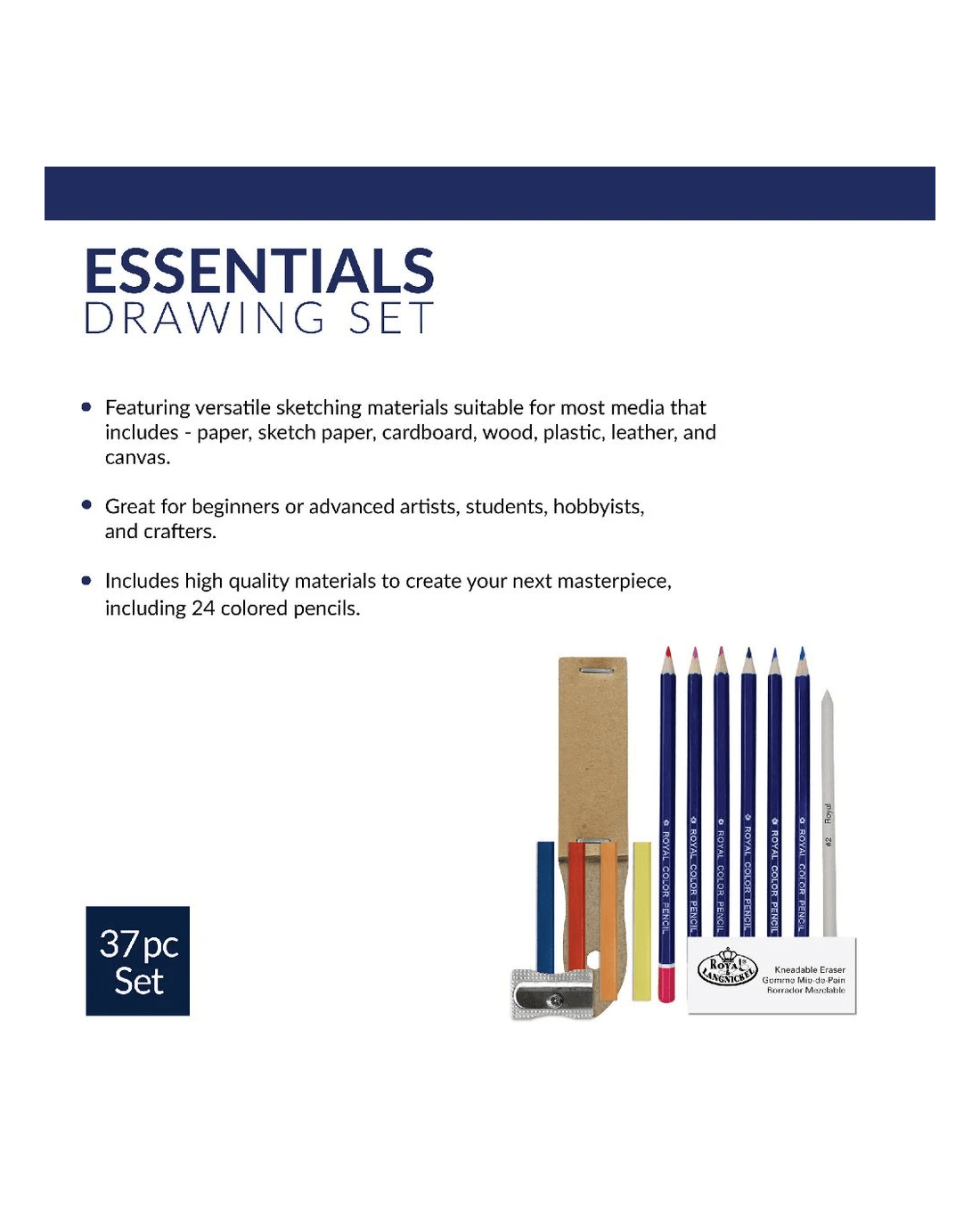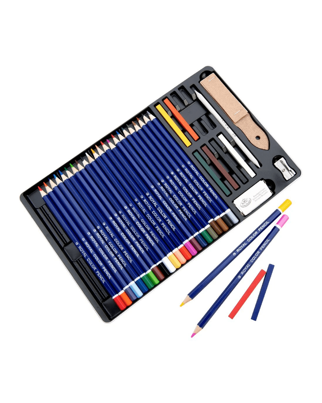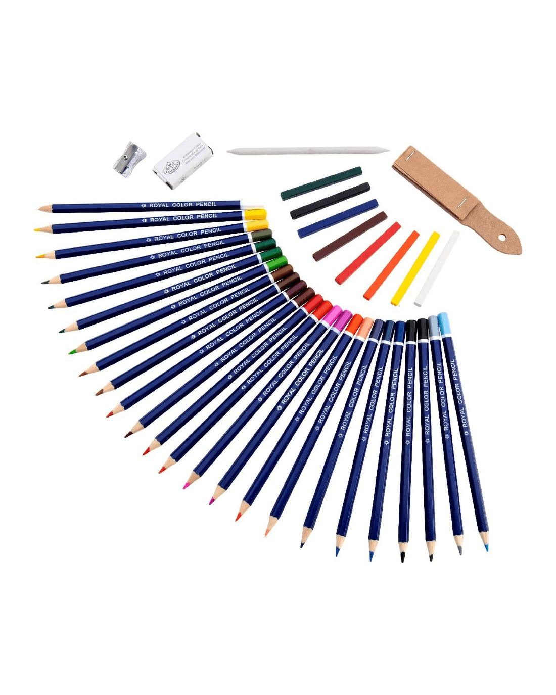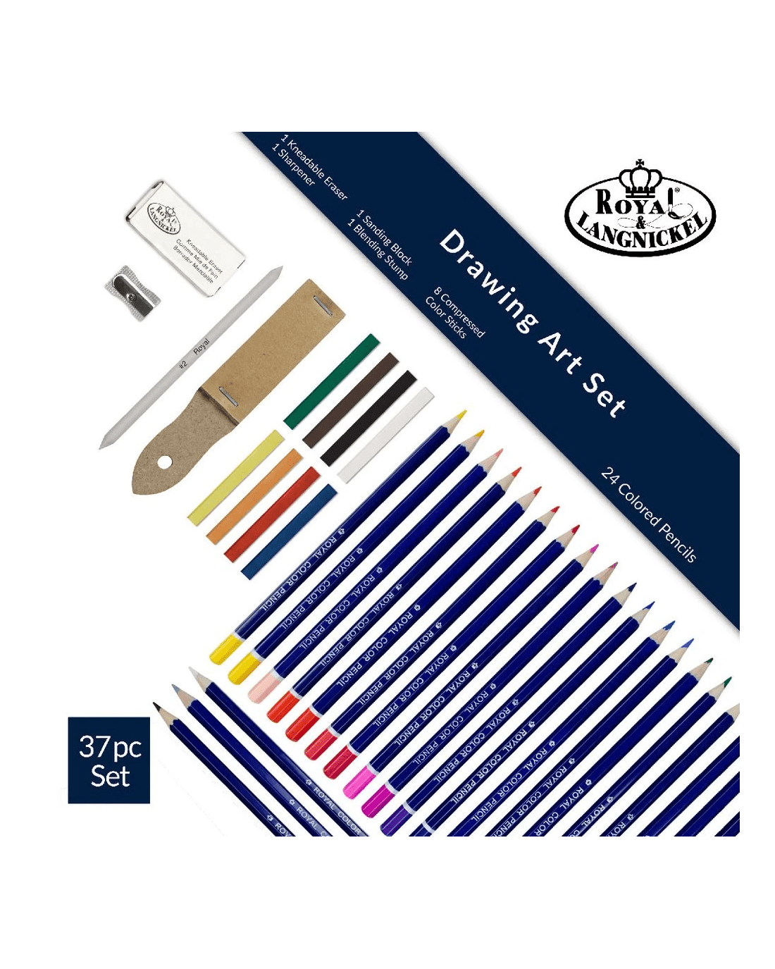 - This set includes 24 pencils, 8 pastels, a sanding block, blending stump, sharpener and kneaded eraser.