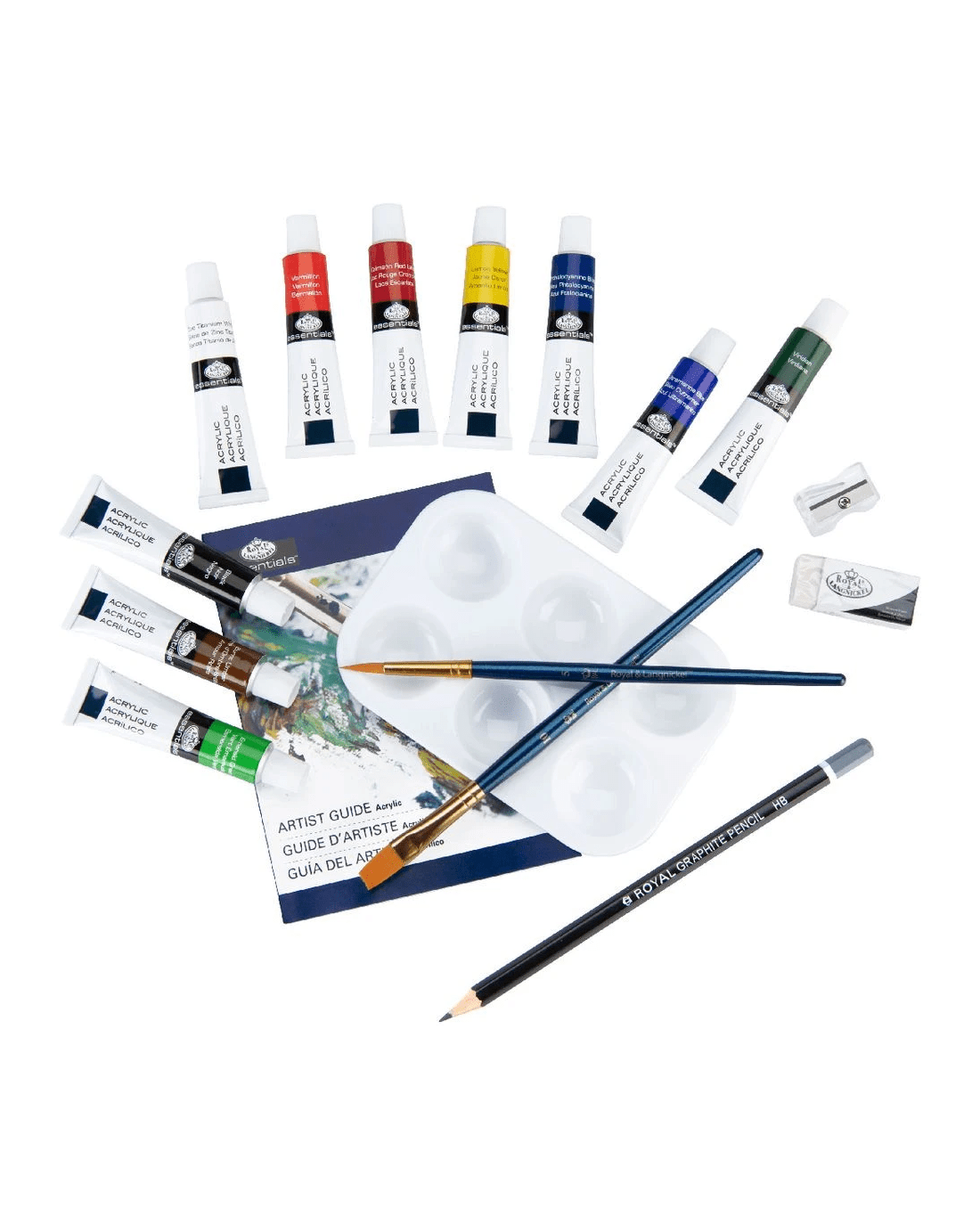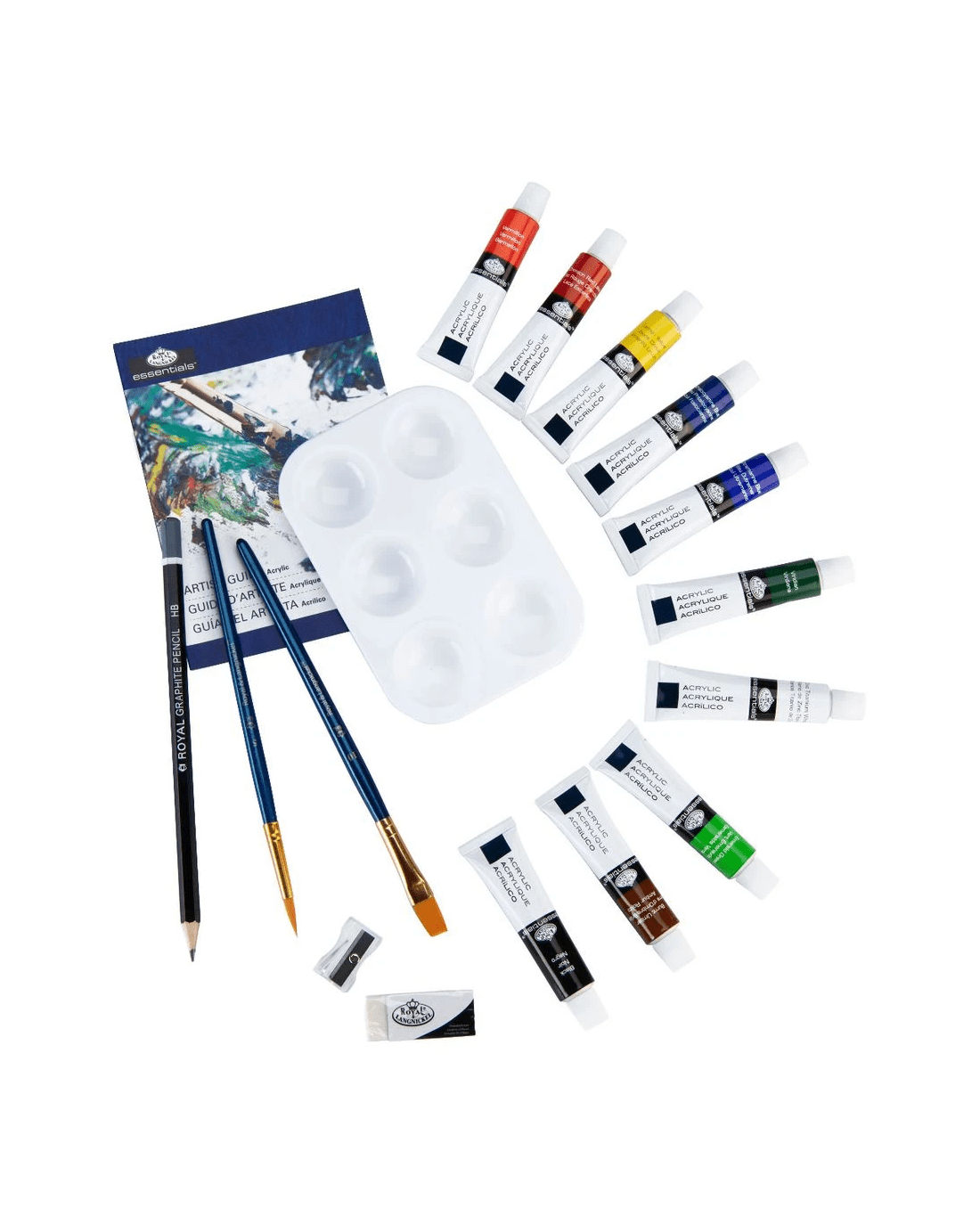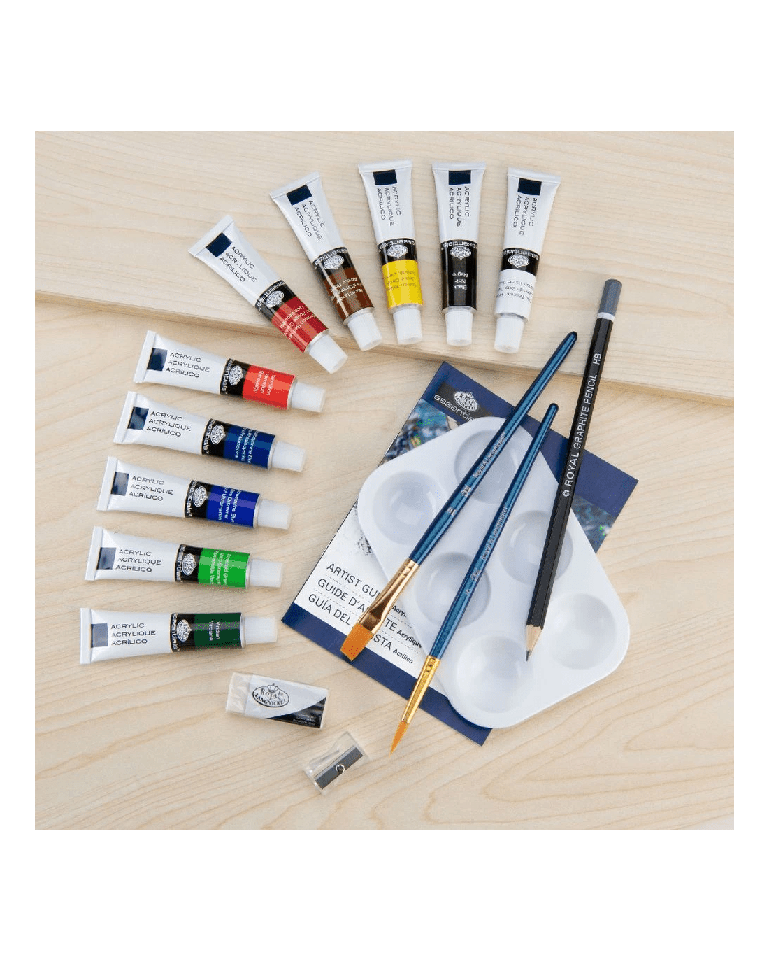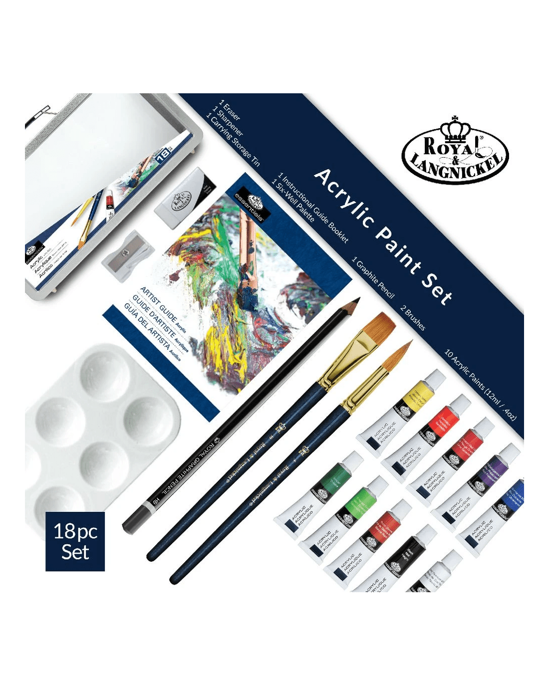 - This set includes 10 acrylic paints, 2 brushes, 1 palette, 1 graphite pencil, 1 sharpener, 1 eraser, 1 instructional guide booklet and a storage tin.