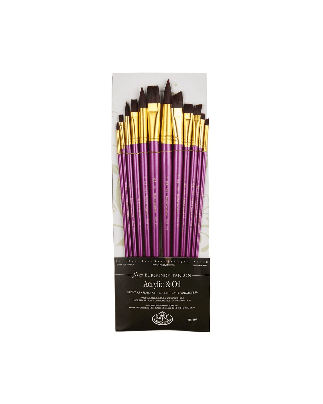 • This pack includes bright brushes 4 and 8, flats 3, 7 and 11, rounds 1, 5, 9 and 12 and angulars 2, 6 and 10.