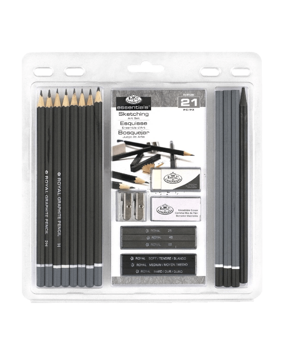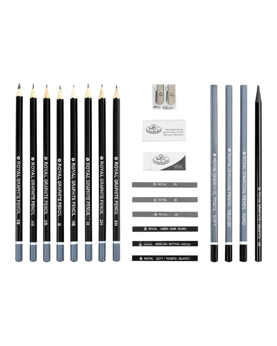 - This set includes 8 graphite pencils, 3 charcoal pencils, 3 charcoal sticks, 3 sketching sticks, a sharpener, eraser, kneading eraser and a woodless graphite pencil.