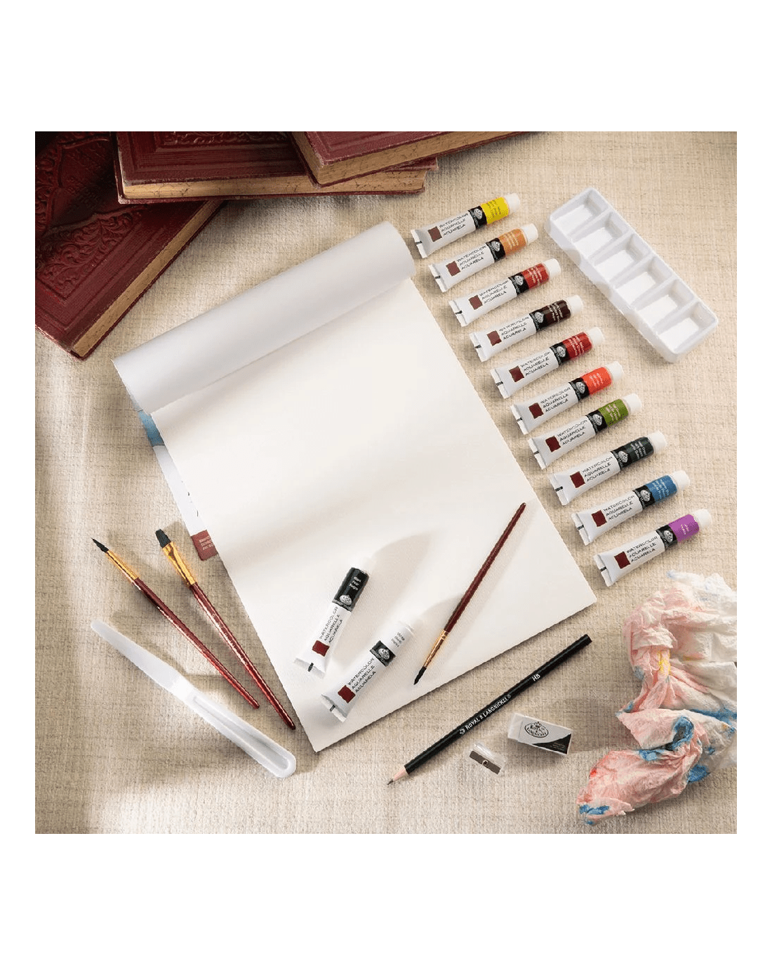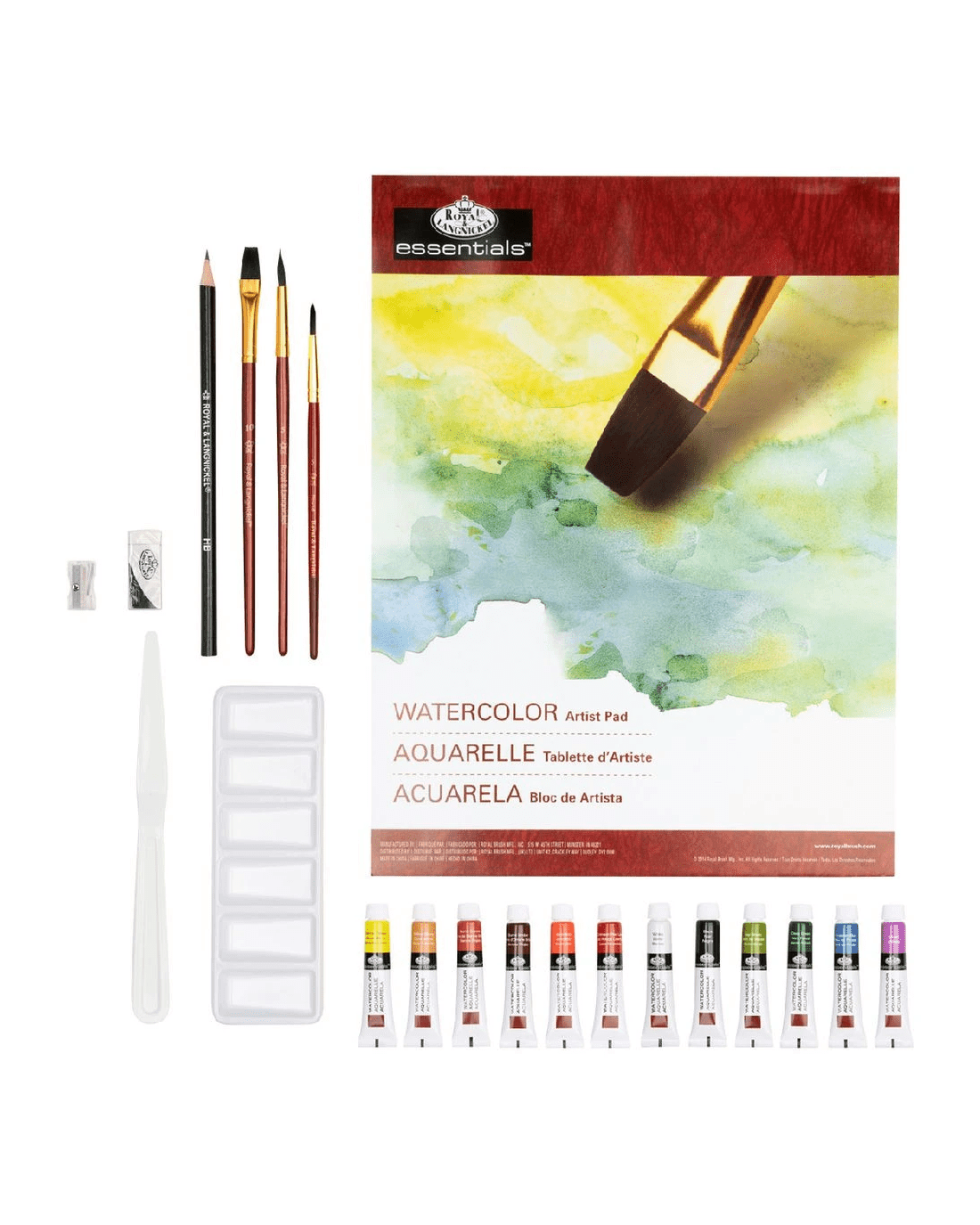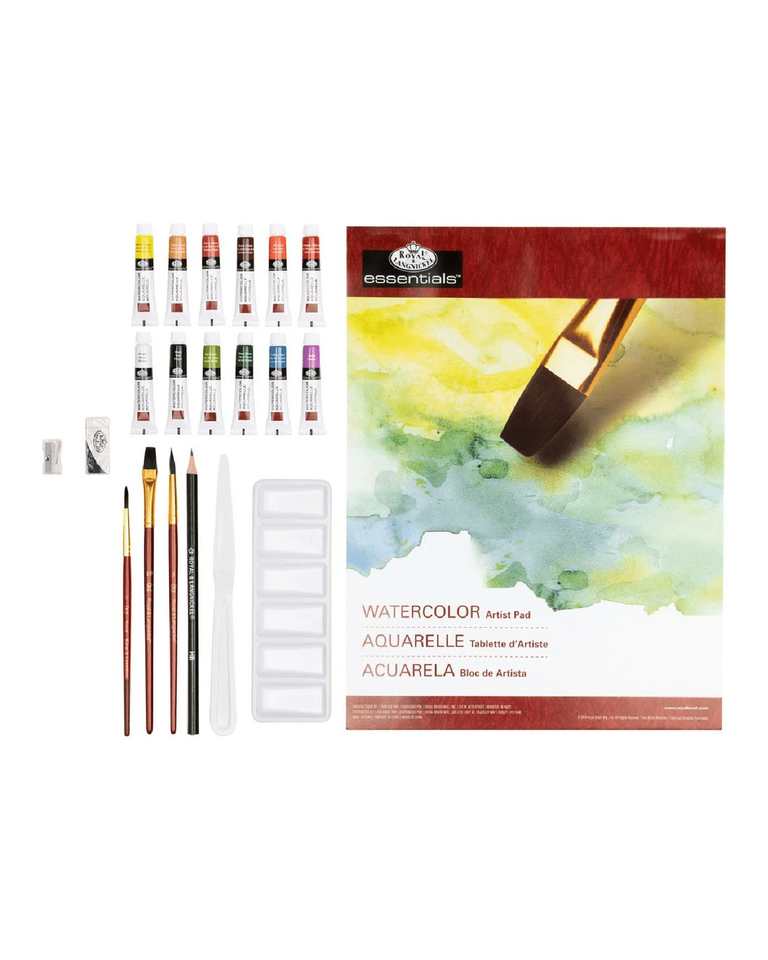 - It comes with 12 x 12ml Watercolour Paints, 3 Brushes, 1 Graphite Pencil, 1 Palette Knife, 1 Six-Well Palette, 1 Eraser, 1 Sharpener, 10 Sheets Watercolour Paper and 1 Instruction Booklet.