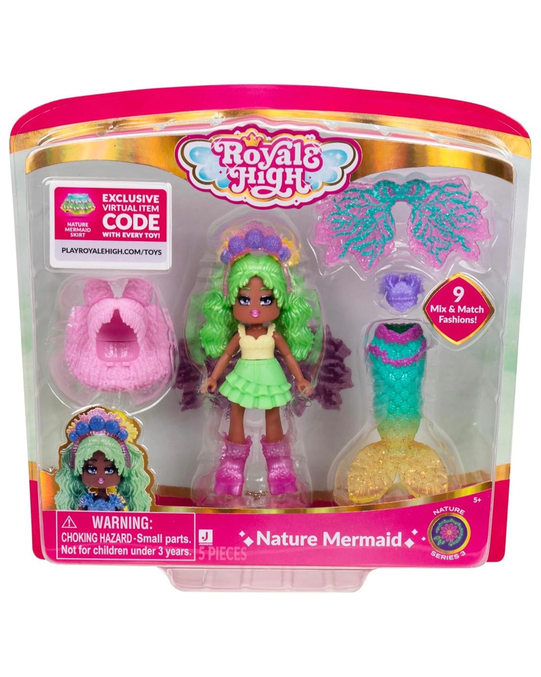 Dive into the enchanting world of Royale High, where fashion meets fintasy—introducing the Nature Mermaid, a stunning 3-inch game-inspired doll with nine outfits for endless styling possibilities. Each doll embodies a unique Element—Dark, Fire, Water, Light, and Nature—inviting you to collect all five from Series 3 to complete your mermaid collection. (Each sold separately) Experience the magic of transformation with our unique design, where the fin becomes elegant wings you can wear as a stunning ring. With the included redeemable virtual item code, you can accessorise your mermaid across all experiences. Officially licensed, this mermaid is perfect for young fashionistas! Ages 5 +