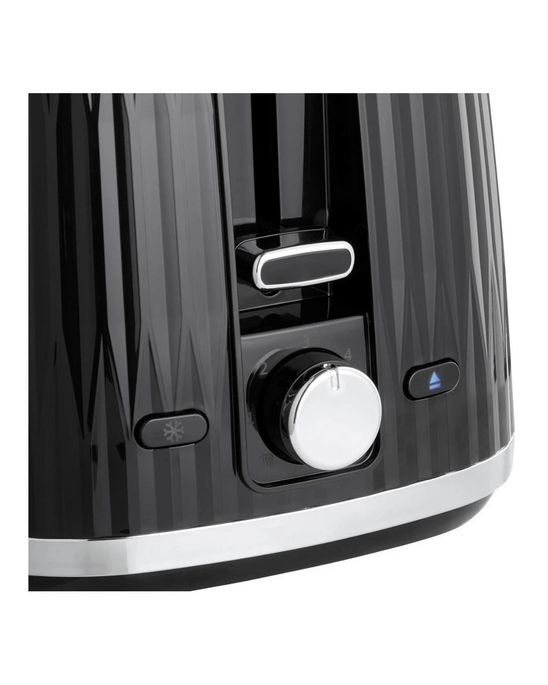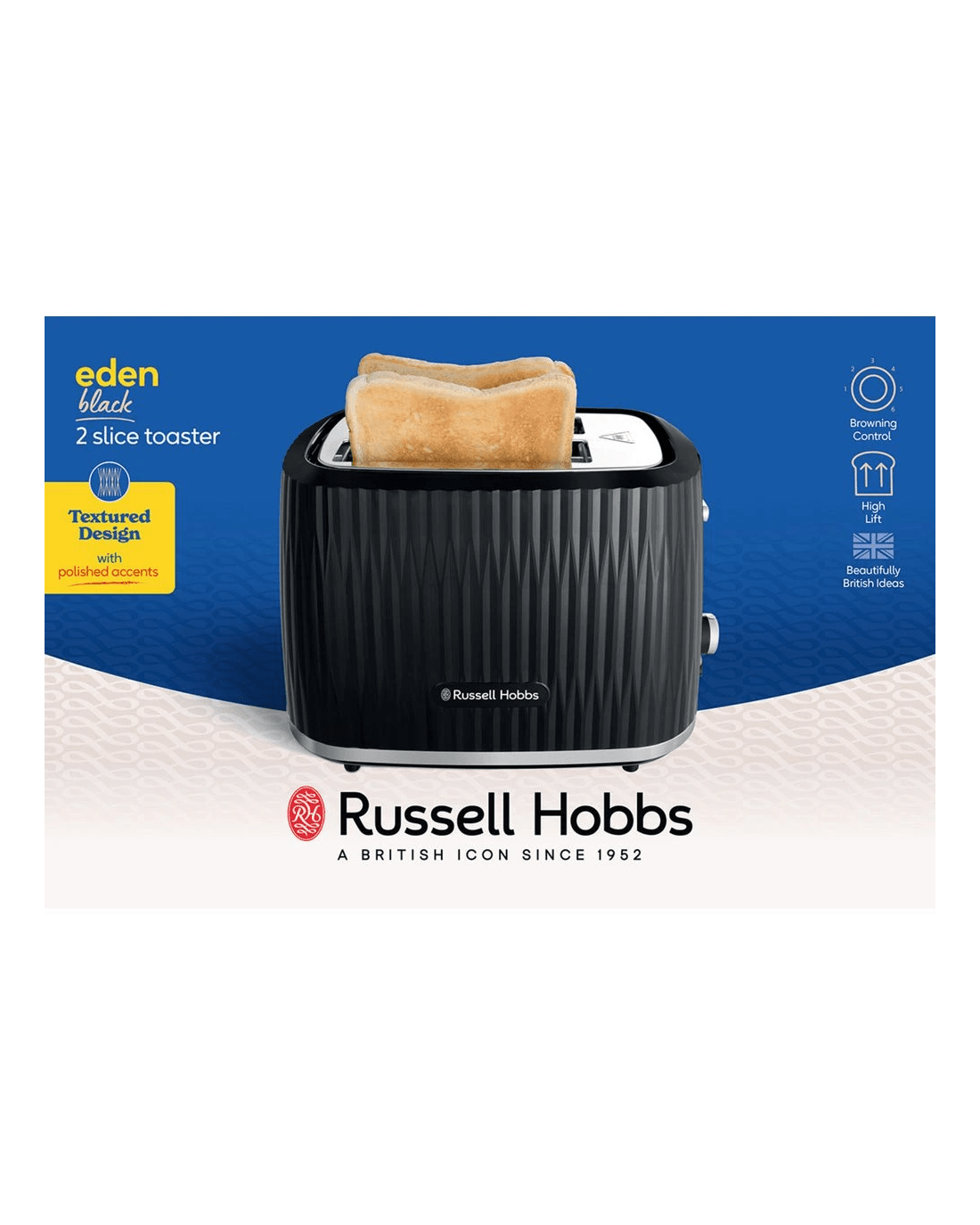 The Russell Hobbs Eden Toaster features a stylish design with chrome accents and an 800W power output. It offers customisable toasting with settings from 1 to 6, along with convenient functions like frozen, reheat, and cancel, plus a high lift for smaller items and a crumb tray for easy cleanup.