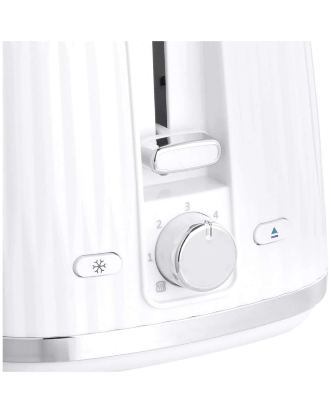 The Russell Hobbs Eden 2 Slice Toaster in White combines style and versatility, making it a perfect addition to any kitchen. Its elegant textured design with chrome accents adds a modern touch, while the adjustable browning settings, ranging from 1 to 6, allow you to customise your toast just the way you like it. Equipped with an 800W heating element, this toaster offers quick, even toasting every time. The high lift feature makes it easy to remove smaller items, while the frozen, reheat, and cancel functions provide extra convenience for a variety of toasting needs. With its chic design and practical features, the Russell Hobbs Eden Toaster brings both form and function to your morning routine.