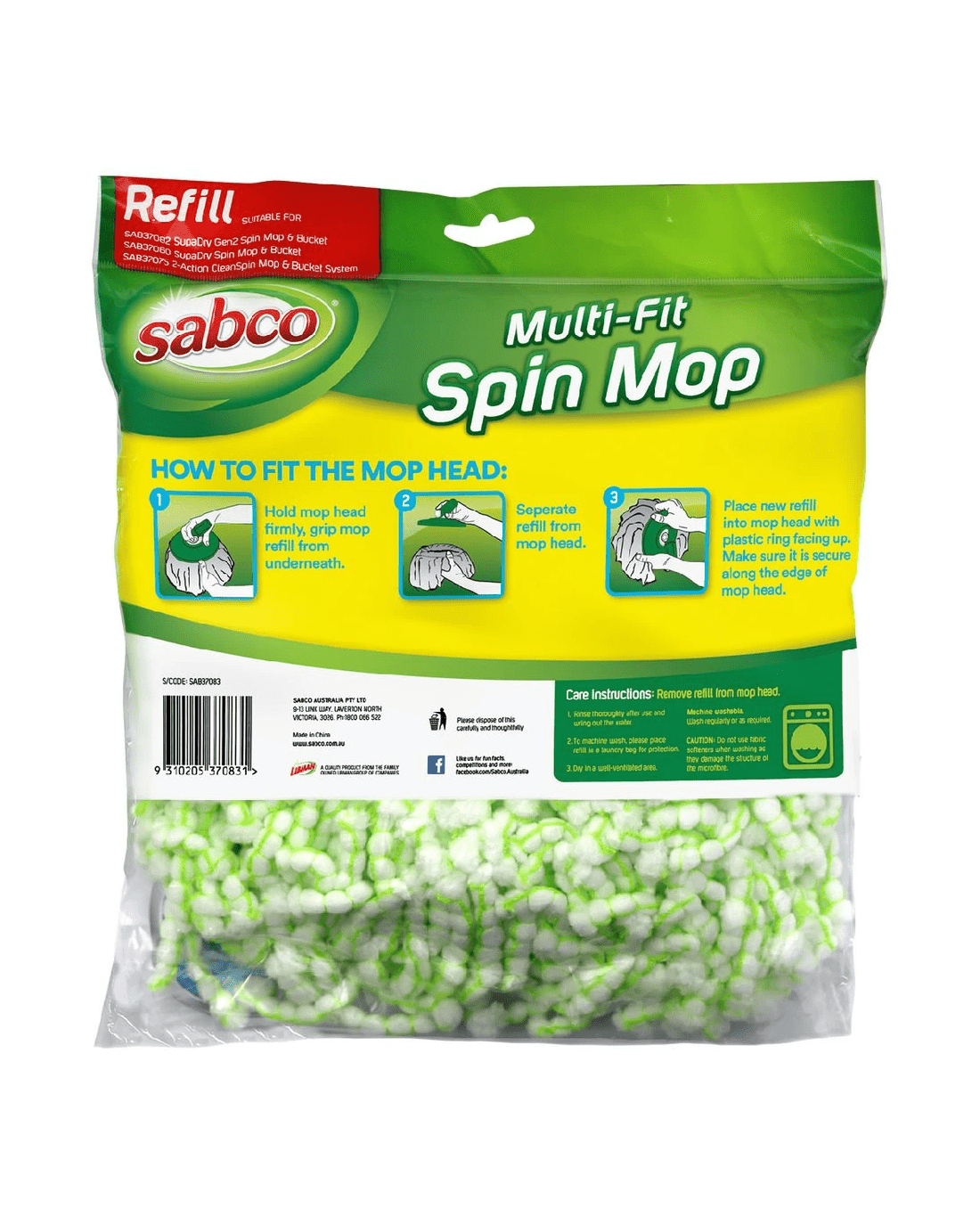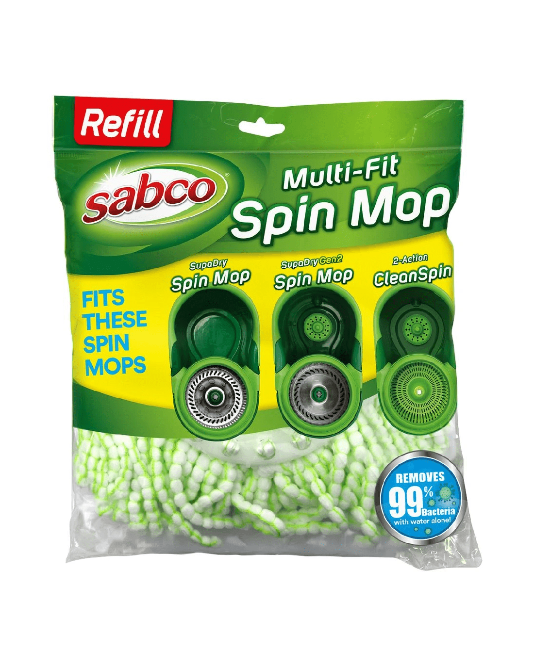 This Sabco Multi-Fit Spin Mop Refill is made of premium microfibre that traps dirt and grime and lifts it away. It's machine washable, hygienic and long-lasting, so you can keep your Sabco Spin Mop or CleanSpin Mop going for longer. With water alone, it can remove 99% of bacteria from surfaces.