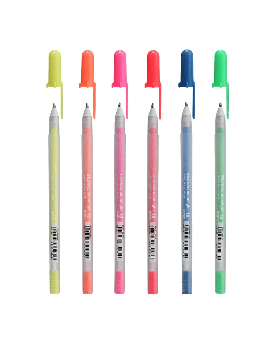 - This set includes six fluorescent gel pens in vibrant colours: Fluorescent Green (#427), Blue (#436), Fluorescent Vermilion (#418), Fluorescent Pink (#420), Fluorescent Orange (#425), and Fluorescent Yellow (#403).