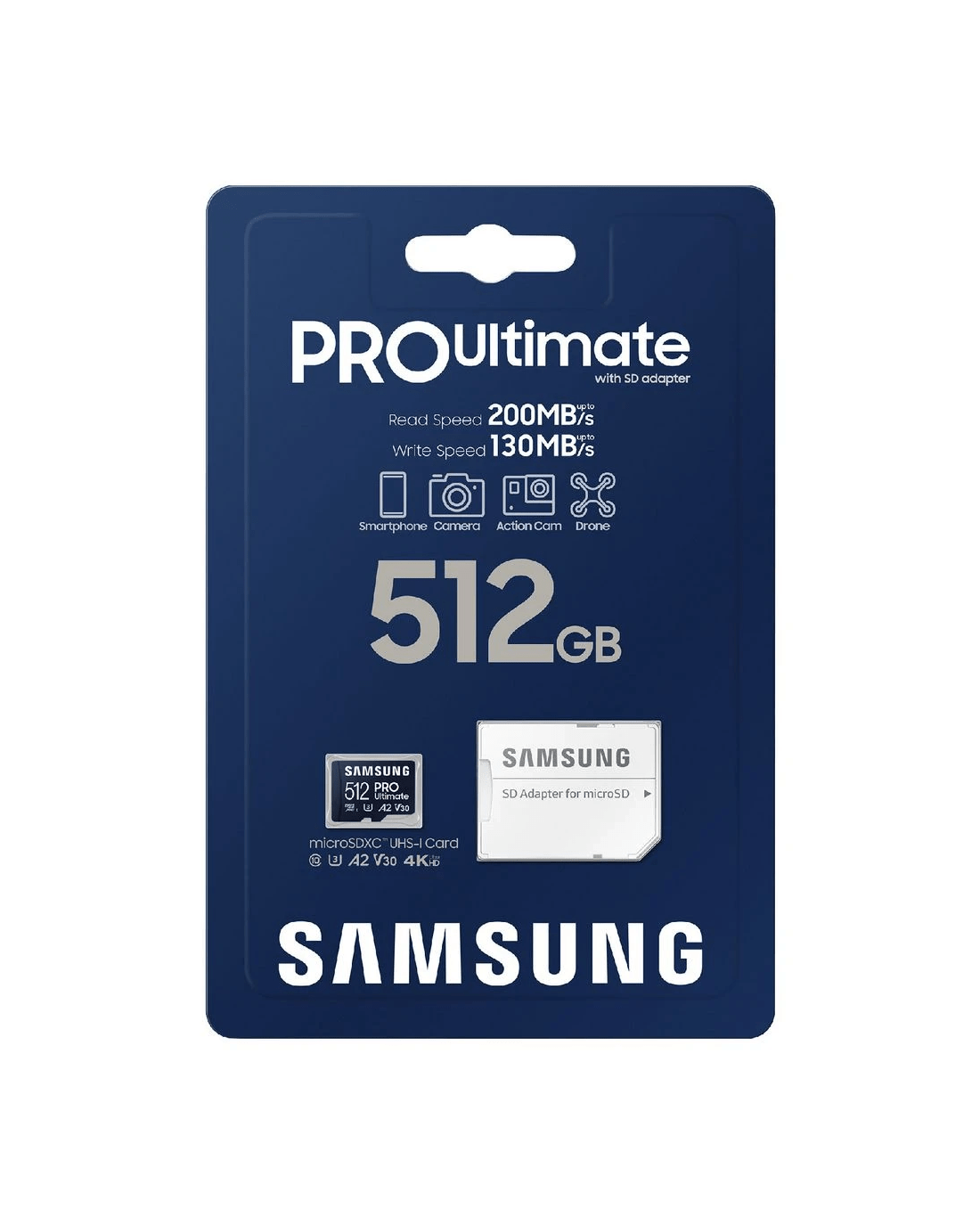 Reach your full creative potential with this Samsung PRO Ultimate microSD Memory Card. Featuring blazing-fast read/write speeds up to 200 Mbps and 130 Mbps respectively, it's perfect for storing videos and gaming collections, offering 4K UHD video support. Boasting 512 GB of storage, this microSD has been built for heavy-duty and professional use, keeping all your data tucked safely away for quick, easy and reliable retrieval.