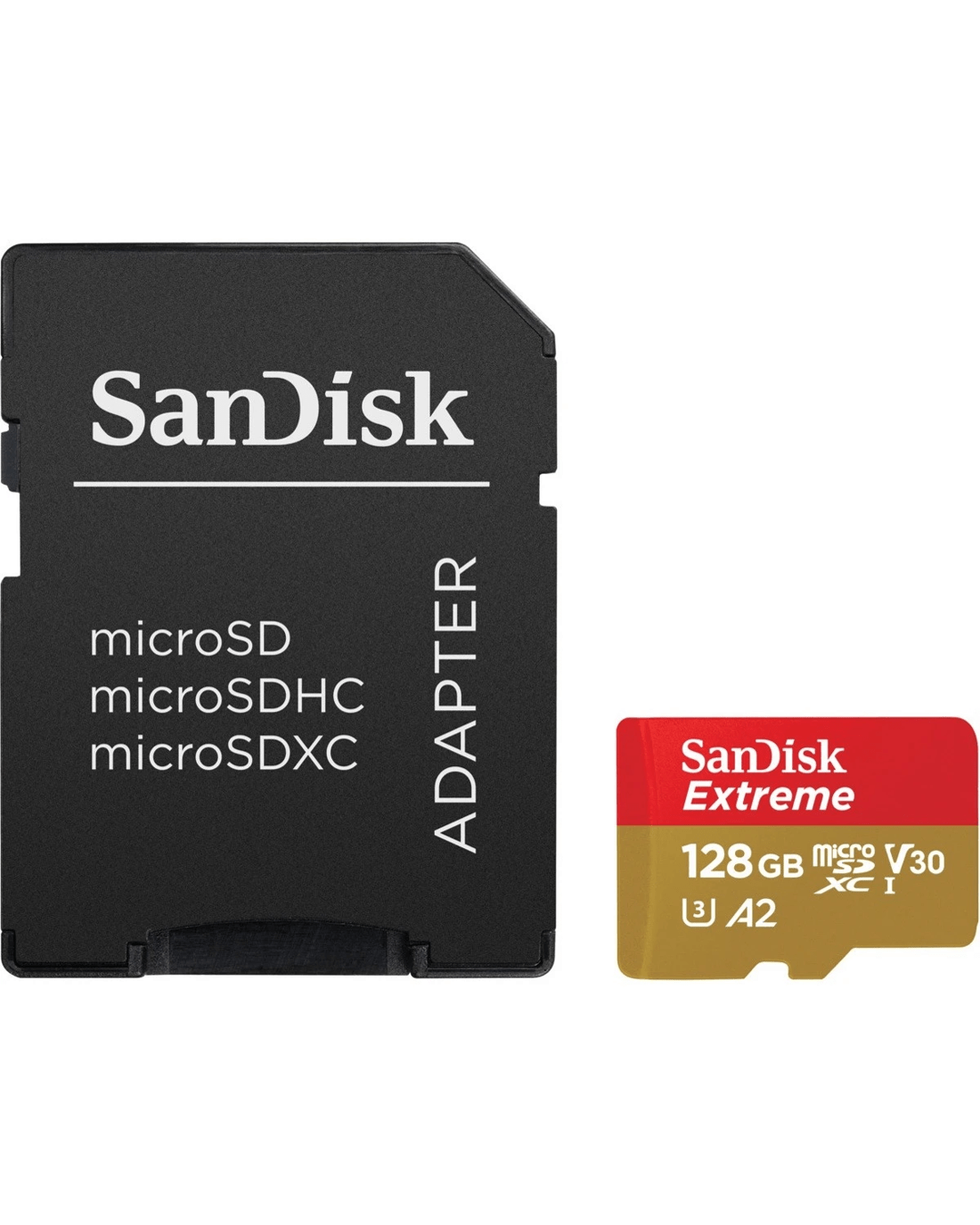 - SanDisk Extreme microSDXC, SQXAA 128GB, V30, U3, C10, A2, UHS-I, 190MB/s R, 90MB/s W, 4x6, SD adaptor