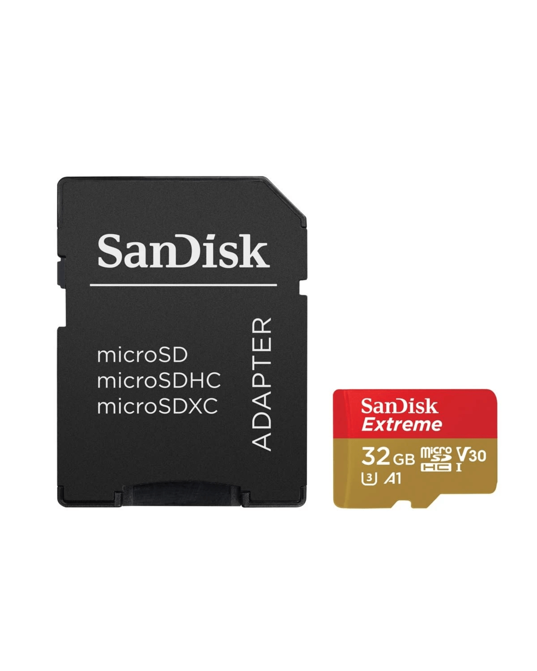 - SanDisk Extreme microSDHC, SQXAF 32GB, V30, U3, C10, A1, UHS-1, 100MB/s R, 60MB/s W, 4x6, SD adaptor