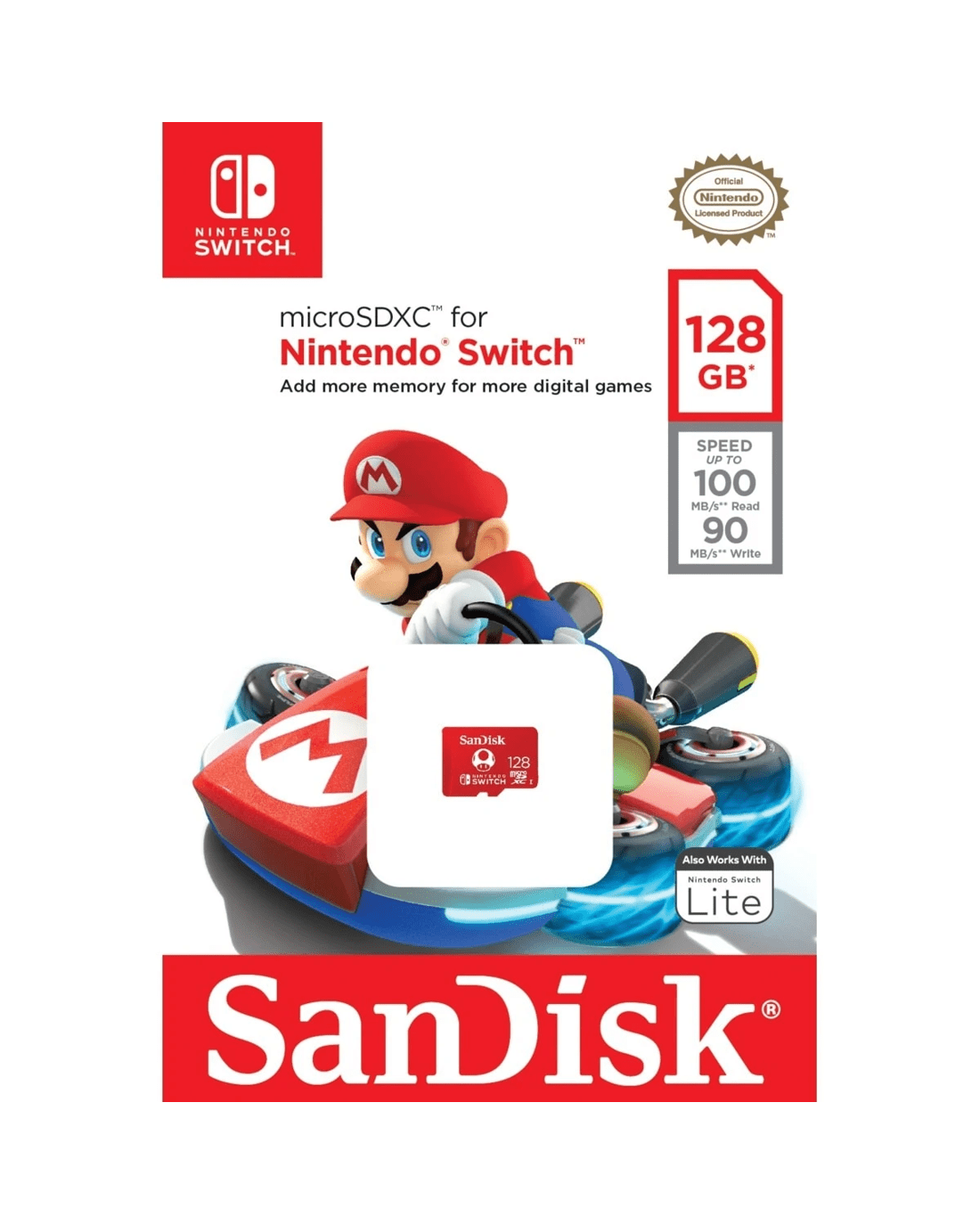 SanDisk microSDXC card for Nintendo Switch. Nintendo-licensed memory card to provide dependable, high-performance storage, the SanDisk microSDXC card for the Nintendo Switch system lets you add up to 512GB of capacity with transfer rates up to 100MB/s. So you can keep your favourite titles on a single card and start playing in no time. And with a lifetime limited warranty, you get gaming storage that’s ready for the long haul.