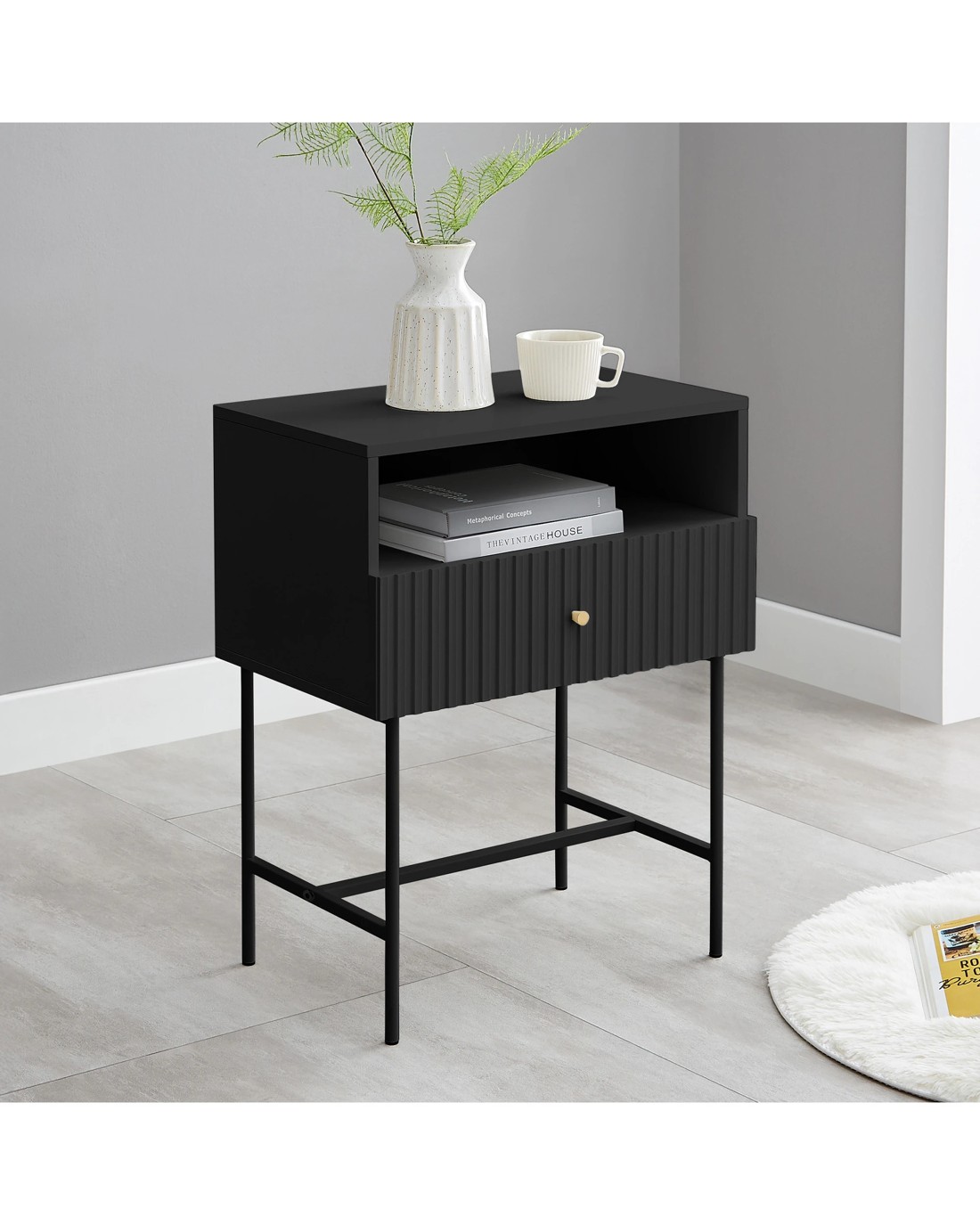 Infuse your space with modern luxury. Say hello to the Cecil Side Table a testament to chic modern style. With its slender fluted design, this night stand exudes sophistication. Showcase your favourite decor on the stylish open shelf, and keep clutter at bay with the spacious drawer. This side table, a fusion of form and function, is a must-have for those who appreciate sleek and contemporary furniture. Elevate any room effortlessly and redefine your space today.