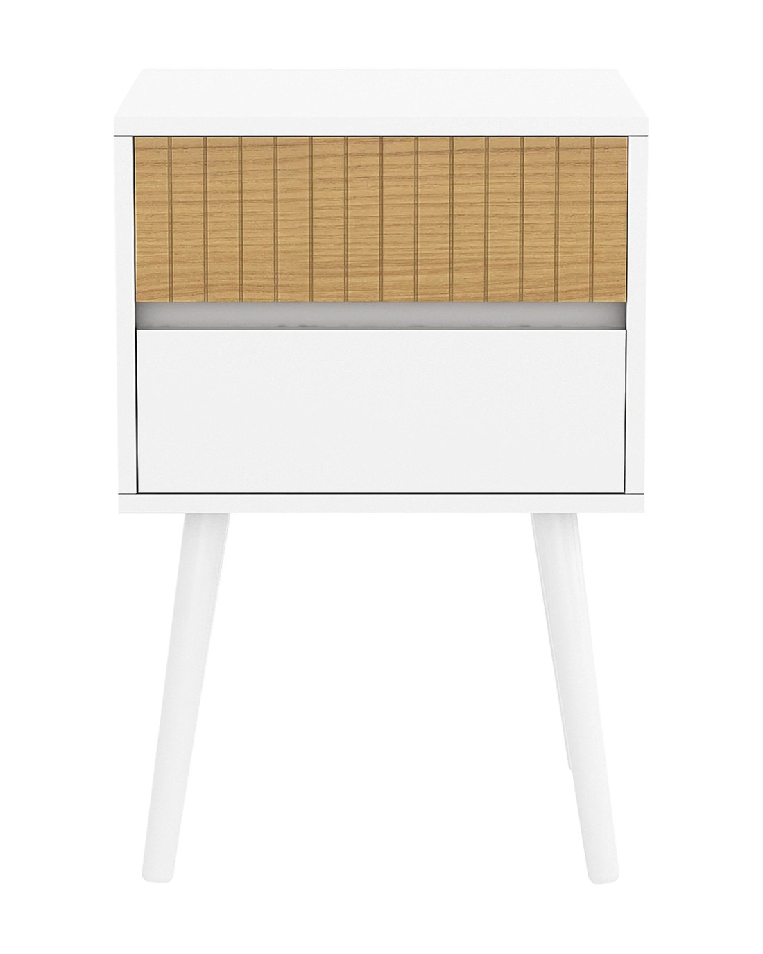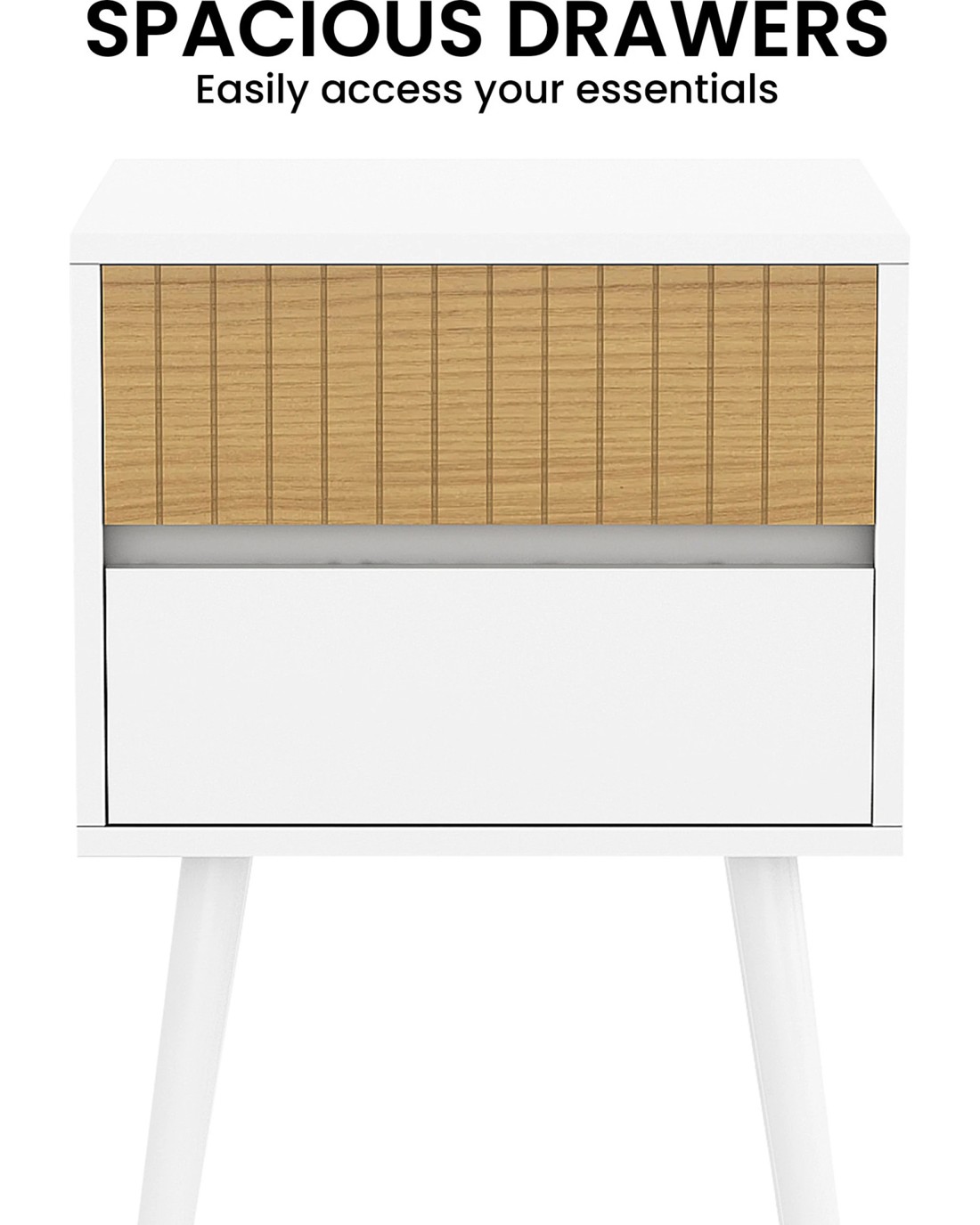 This contemporary side table by Sarantino elevates your space with a captivating blend of Scandinavian style and functional design. The two drawers offer spacious storage, while the fluted design on the top drawer cover adds a touch of artistic elegance. Supported by sturdy pinewood legs, this side table forms a strong foundation. Bring a breath of fresh, contemporary air to your home with the Clio Side Table.