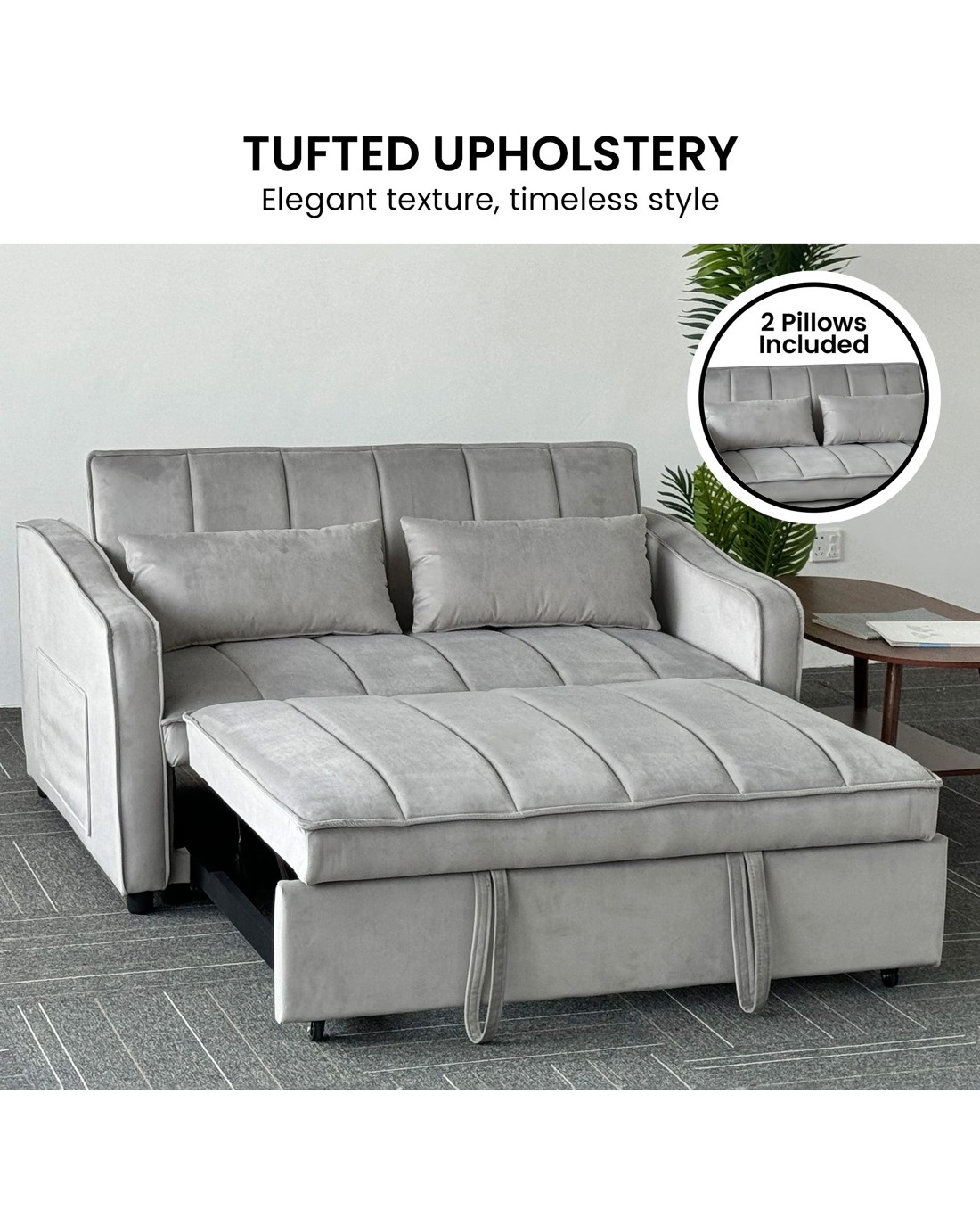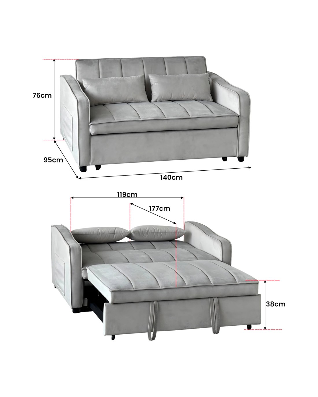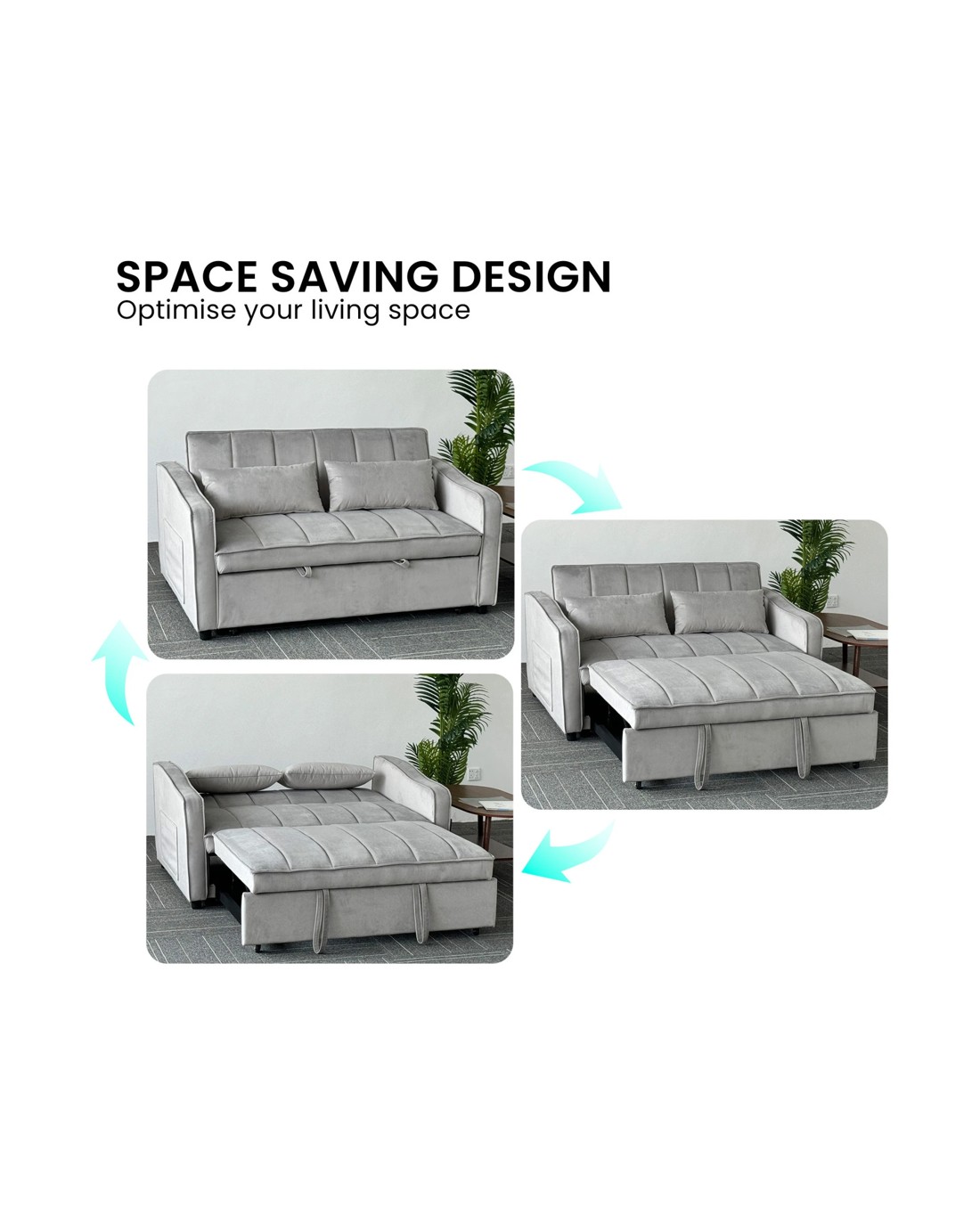 Maximise your space with the stylish Fenton Two-Seater Sofa Bed by Sarantino. This sofa easily changes from a chic sofa to a comfy bed, so its perfect for hosting friends or just kicking back at home. Its built with a solid wood frame, sleek plastic legs and comfy tufted padding for great durability and chic design. Wrapped in soft velvet, it comes with two cosy pillows for extra comfort.