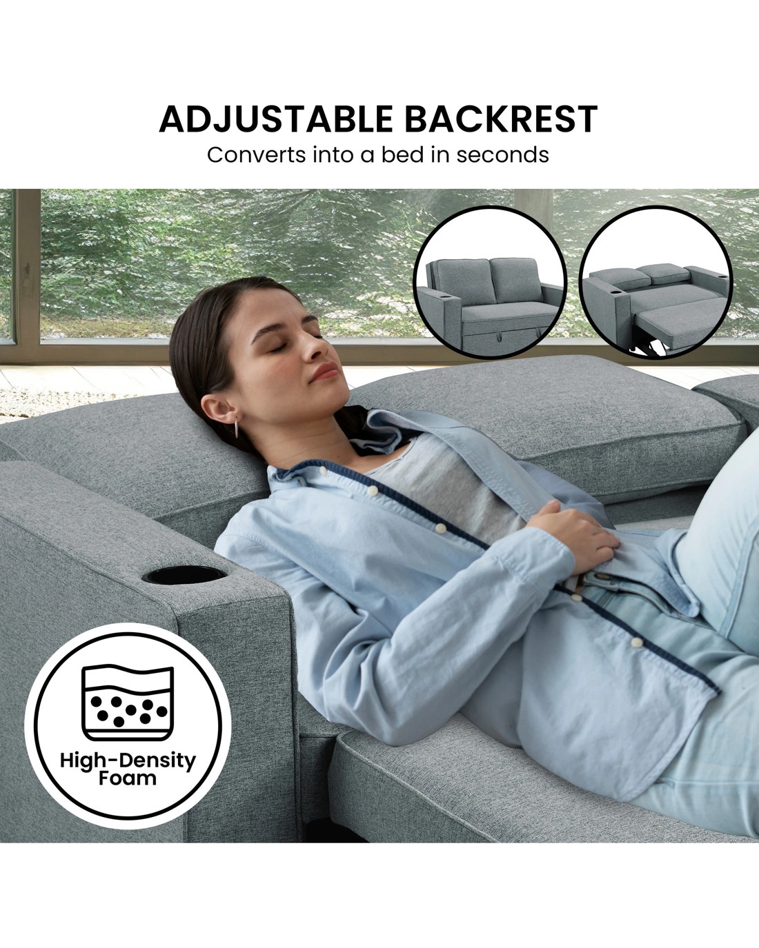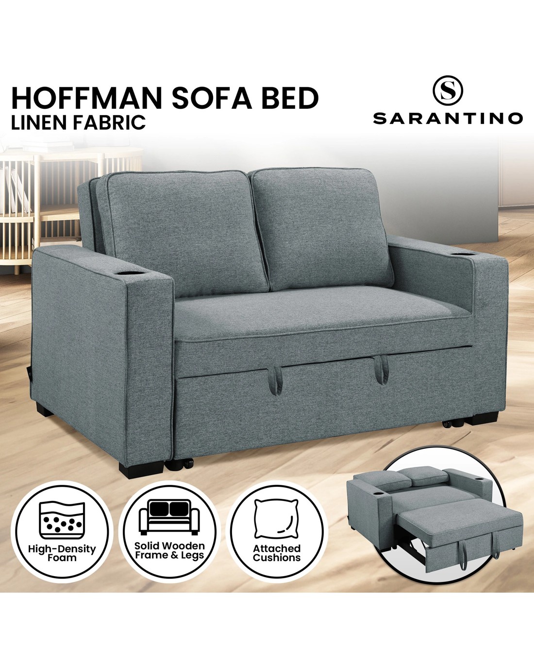 Sold by Klika GroupSarantino Hoffman Linen Sofa Bed With Cushions And Cup Holders Airforce Blue