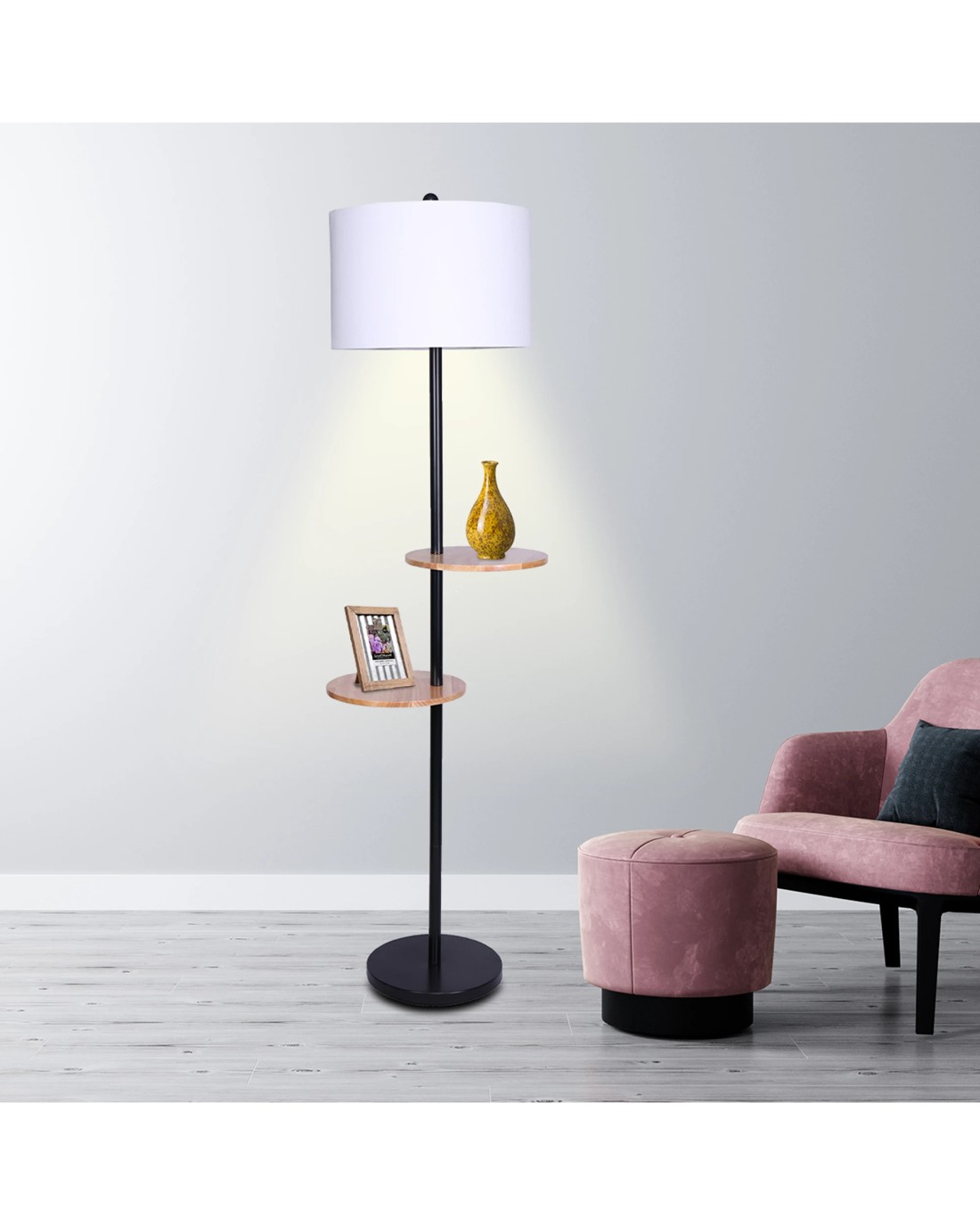 Simple yet stylish, this shelf floor lamp offers more than just illumination for your home. It has two round wooden shelves on opposite sides, allowing you to create interesting displays for your living room, bedroom, or office. They're also useful for storing remotes, smartphones, and other small items.