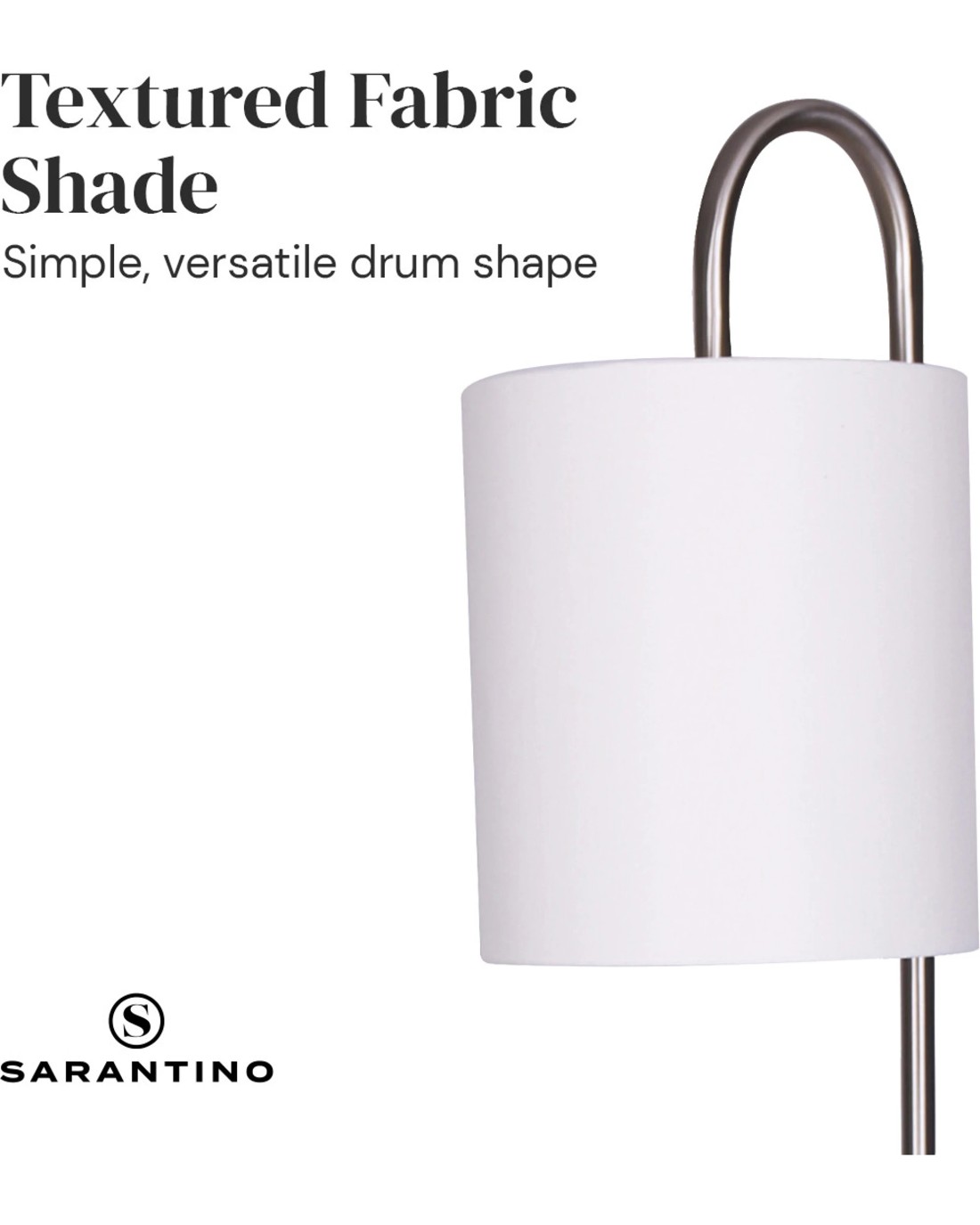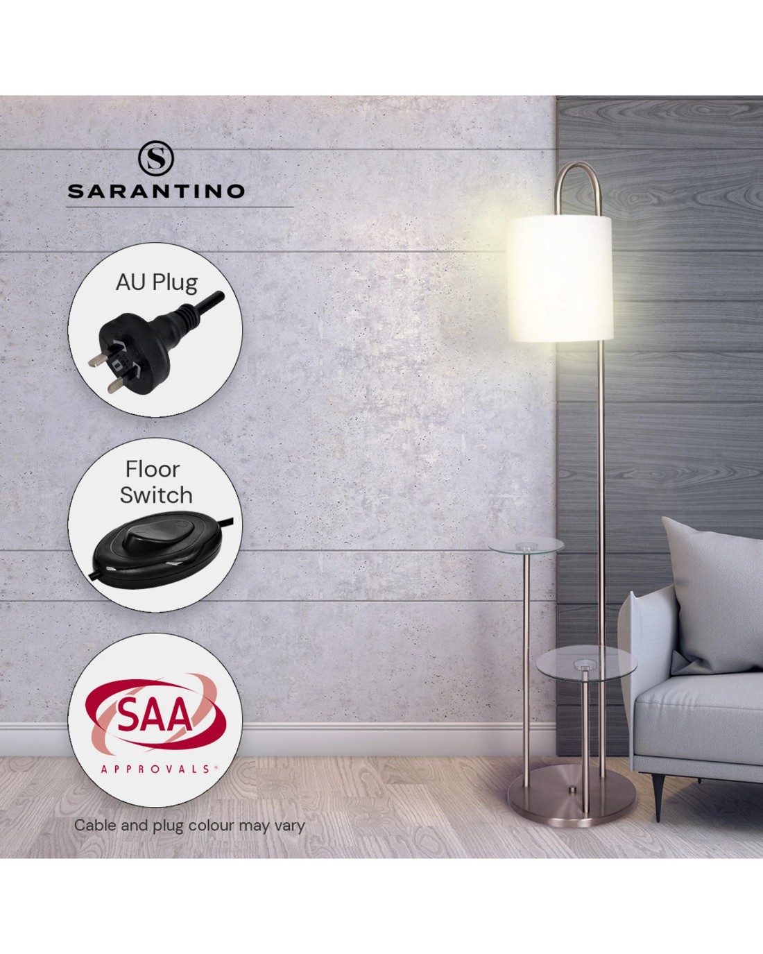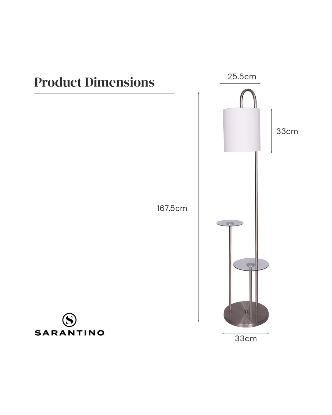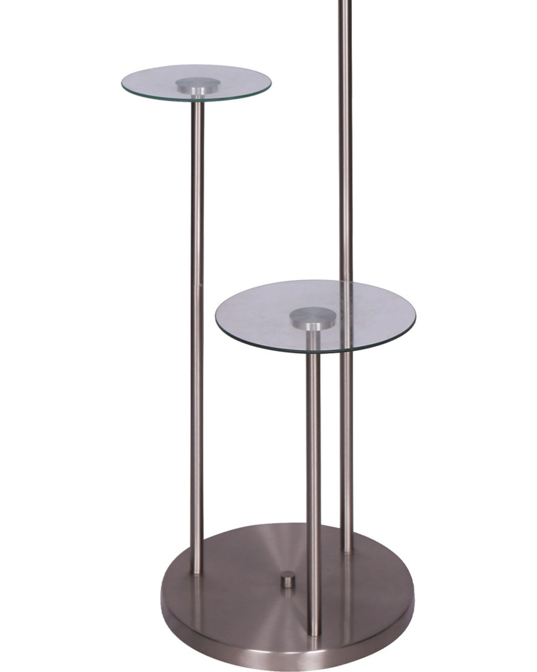The ultimate space-saving solution for beside the sofa, this shelf floor lamp will provide two tiers of table storage space as well as decorative lighting with just a 20-inch footprint. A brushed steel finish paired with clear glass tabletops and a textured white fabric shade creates a modern, upscale look.