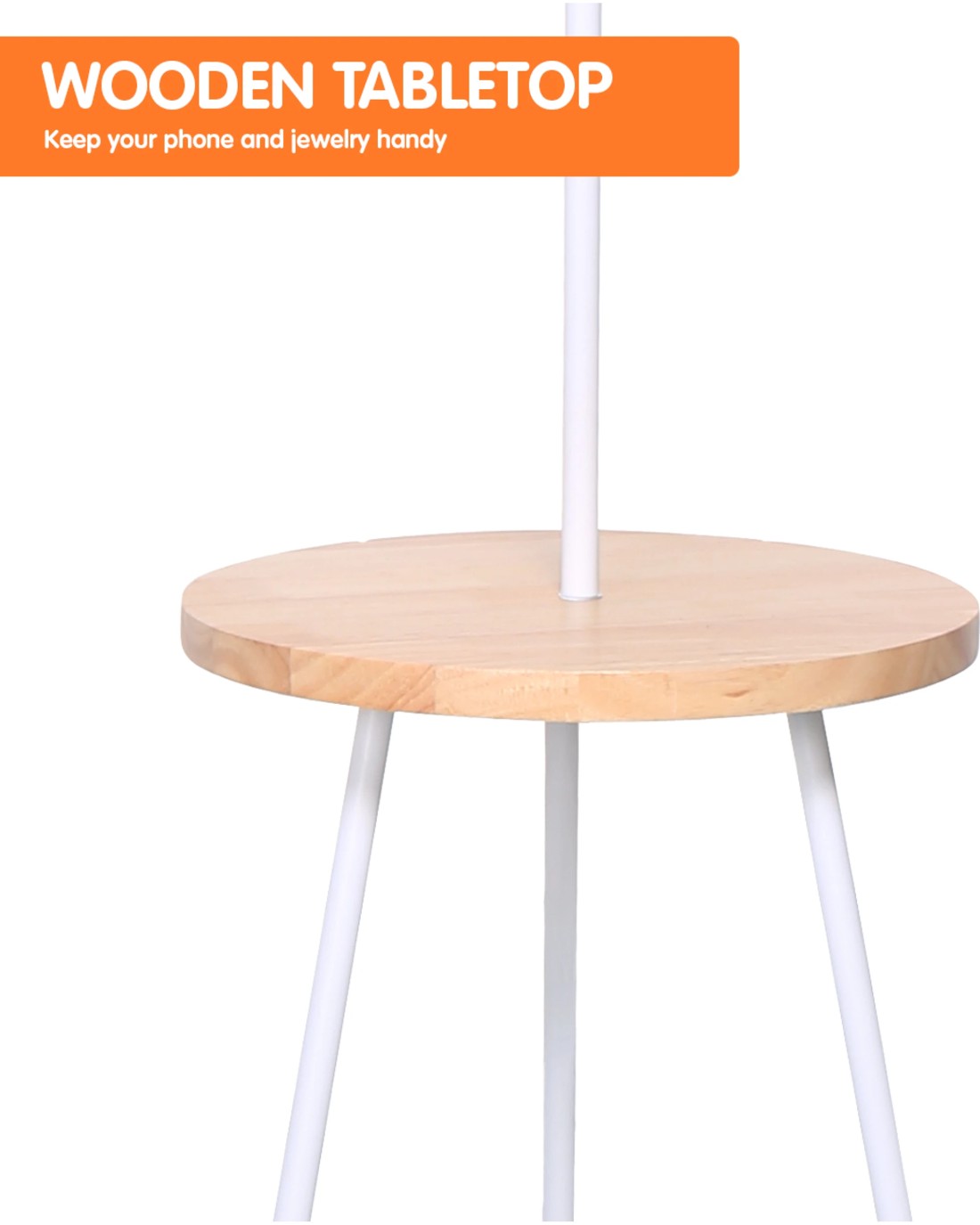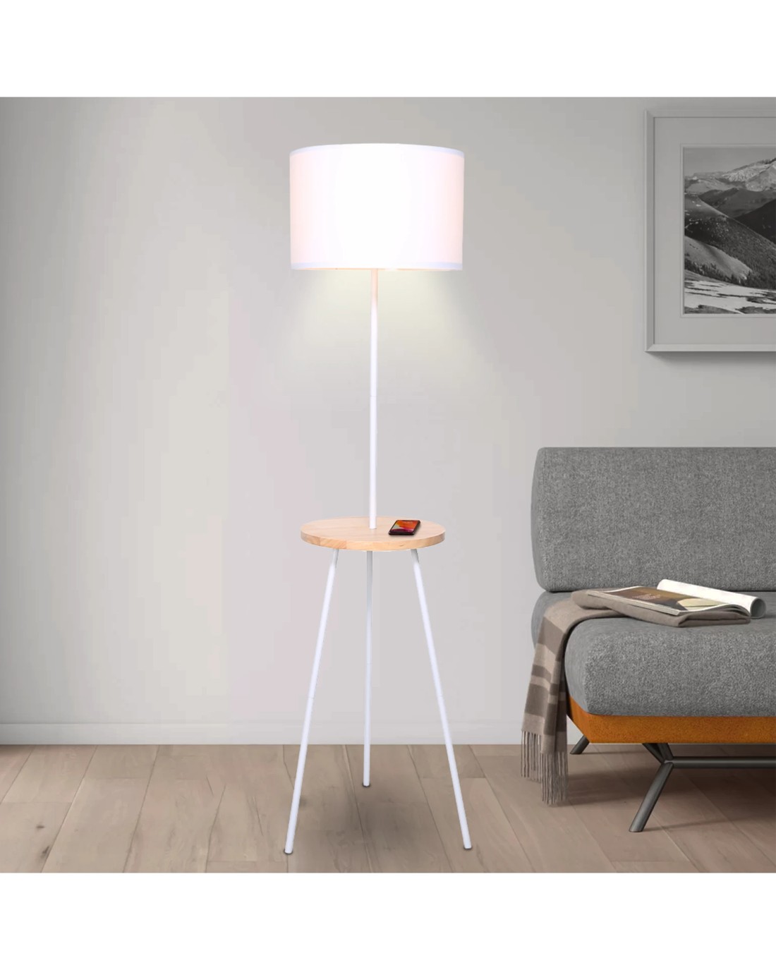Save floor space in your living room, bedroom, or office with this unique tripod floor lamp. It features a wooden tabletop that's perfect for displaying photos or keeping remotes, smartphones, and other essential items nearby.
