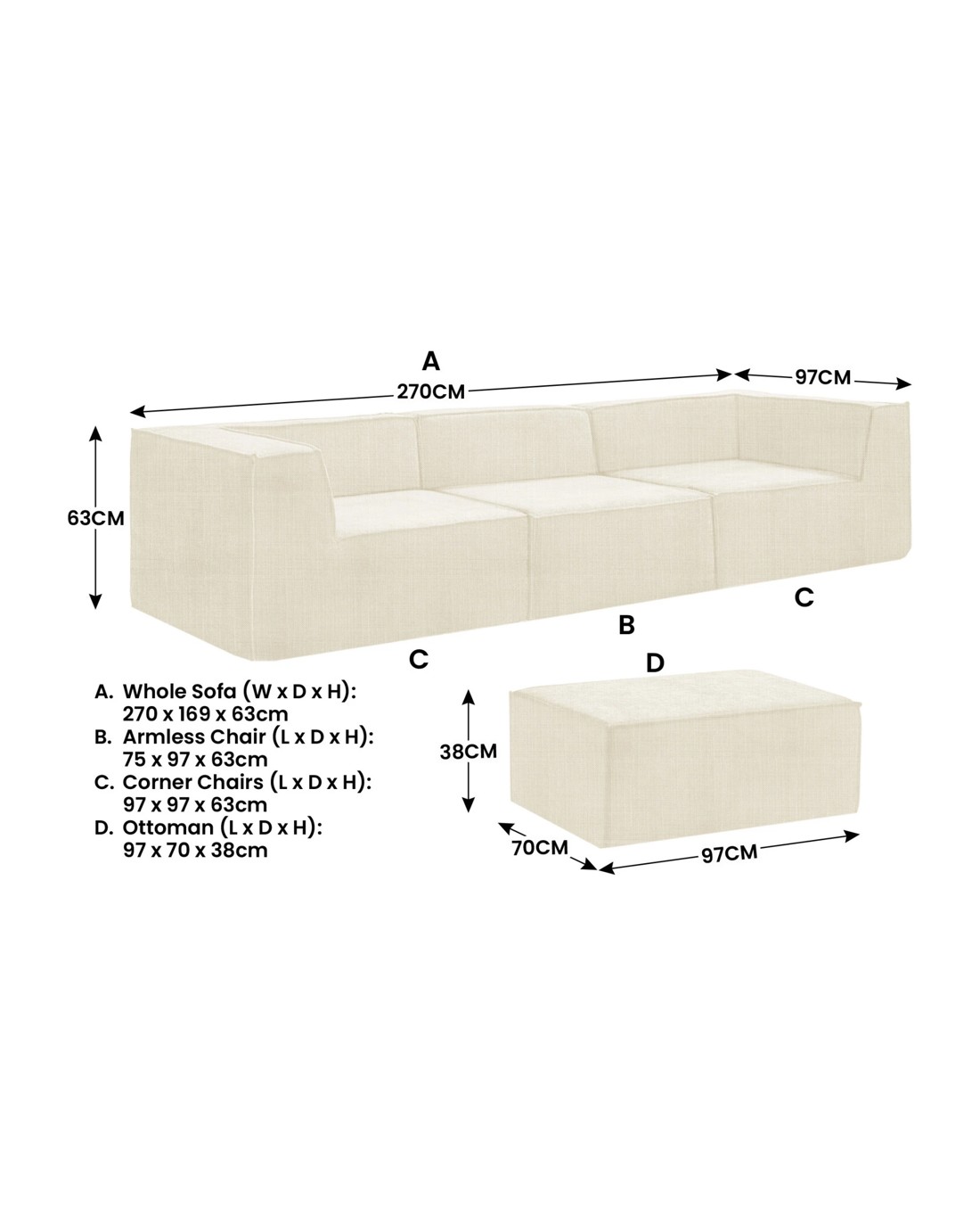Sarantino Novi 3-Seater Modular Sofa with Ottoman in Cream Non-Slip Bottom Lounge