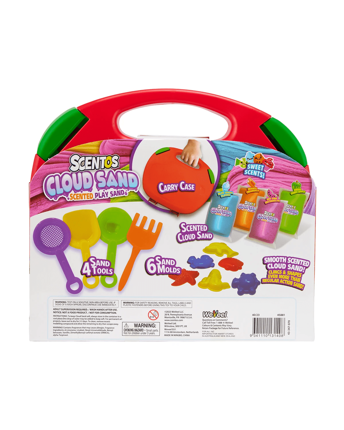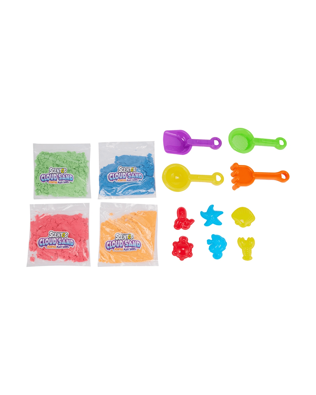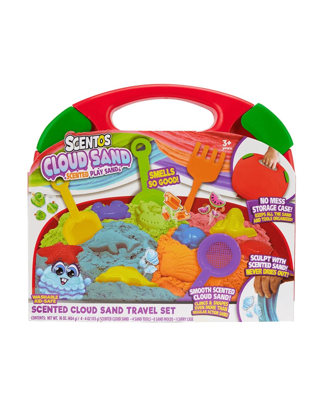 - Includes 4 x sand tools, 6 x sand moulds, scented cloud sand and carry case