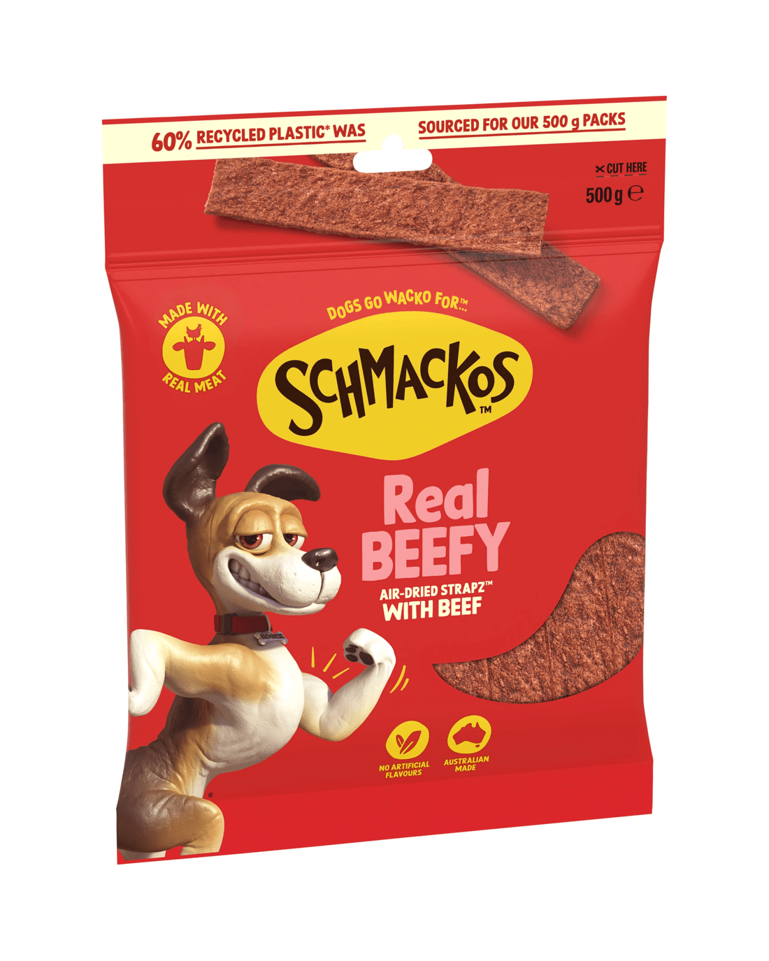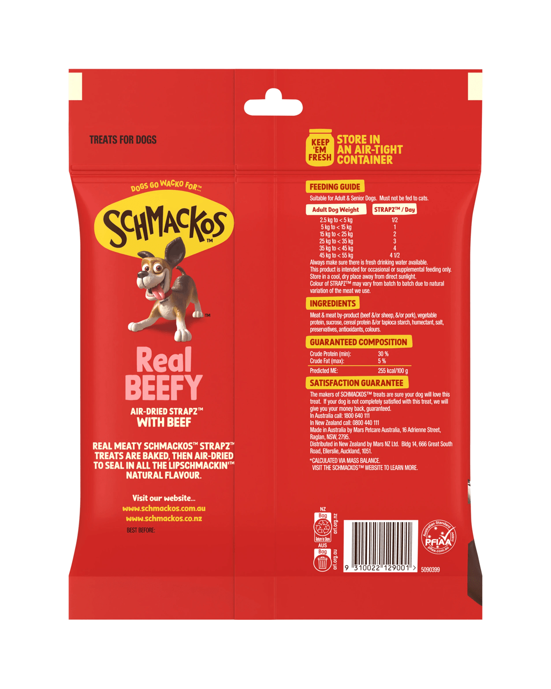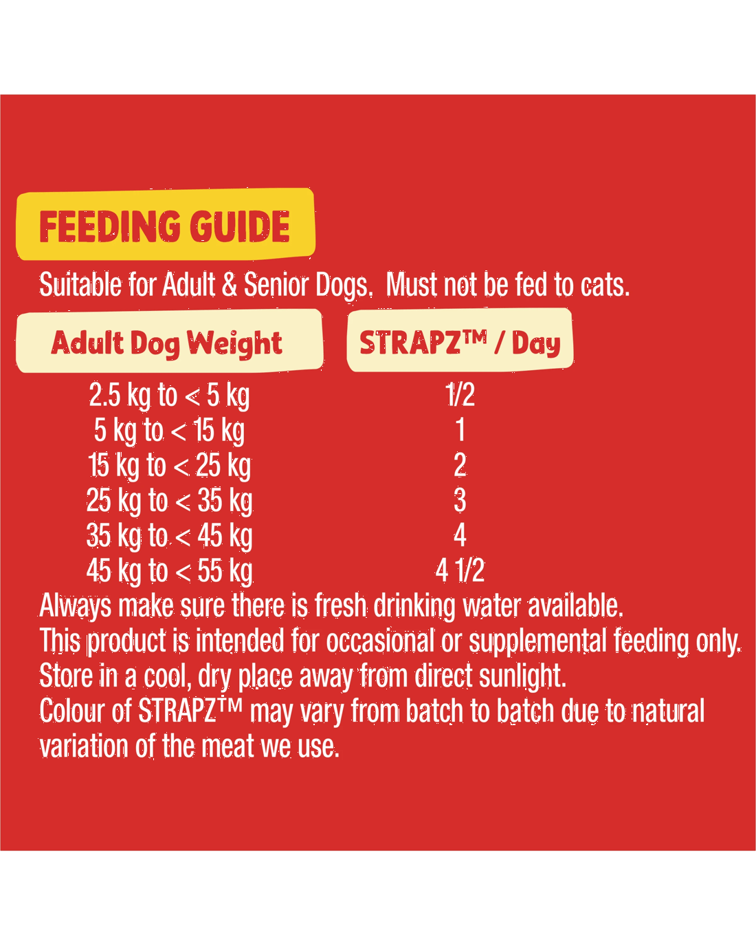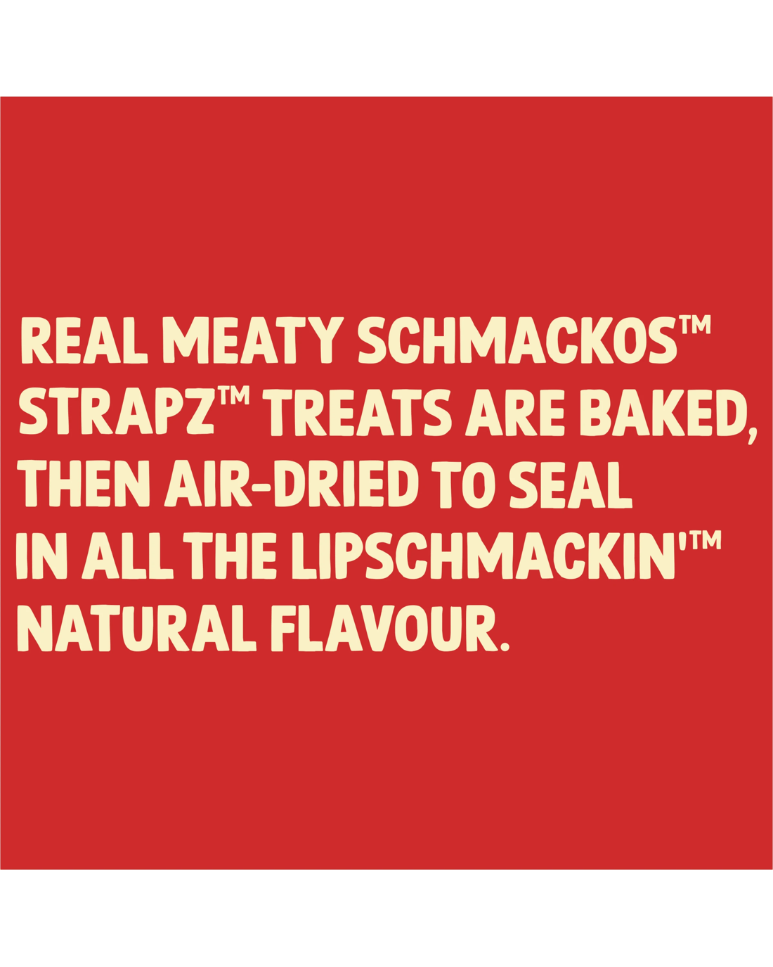 Schmackos branded products include an irresistible range of dog treats that are perfect for playing, training, rewarding and occupying our furry friends. Because these treats are specifically designed to smell and taste absolutely amazing...to a dog. Dogs Go Wacko for Schmackos. The Schmackos brand philosophy is to help dogs and their humans have more fun together. As soon as Schmackos treats are taken out of the cupboard, fun follows. And that's the way it should be. Strapz Treats are baked then air dried to seal in the delicious flavour of real meat.