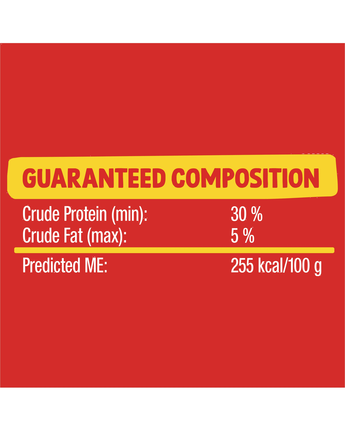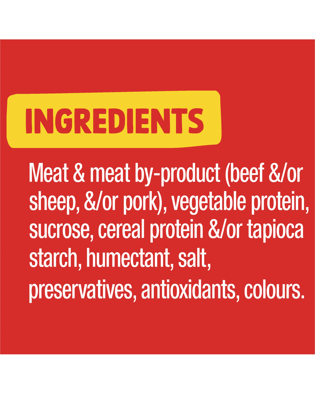 - Ingredients: Meat & Meat By-Product (Beef &/or Sheep &/or Pork), Vegetable Protein, Sucrose, Cereal Protein &/or Tapioca Starch, Humectant, Salt, Preservatives, Antioxidants, Colours