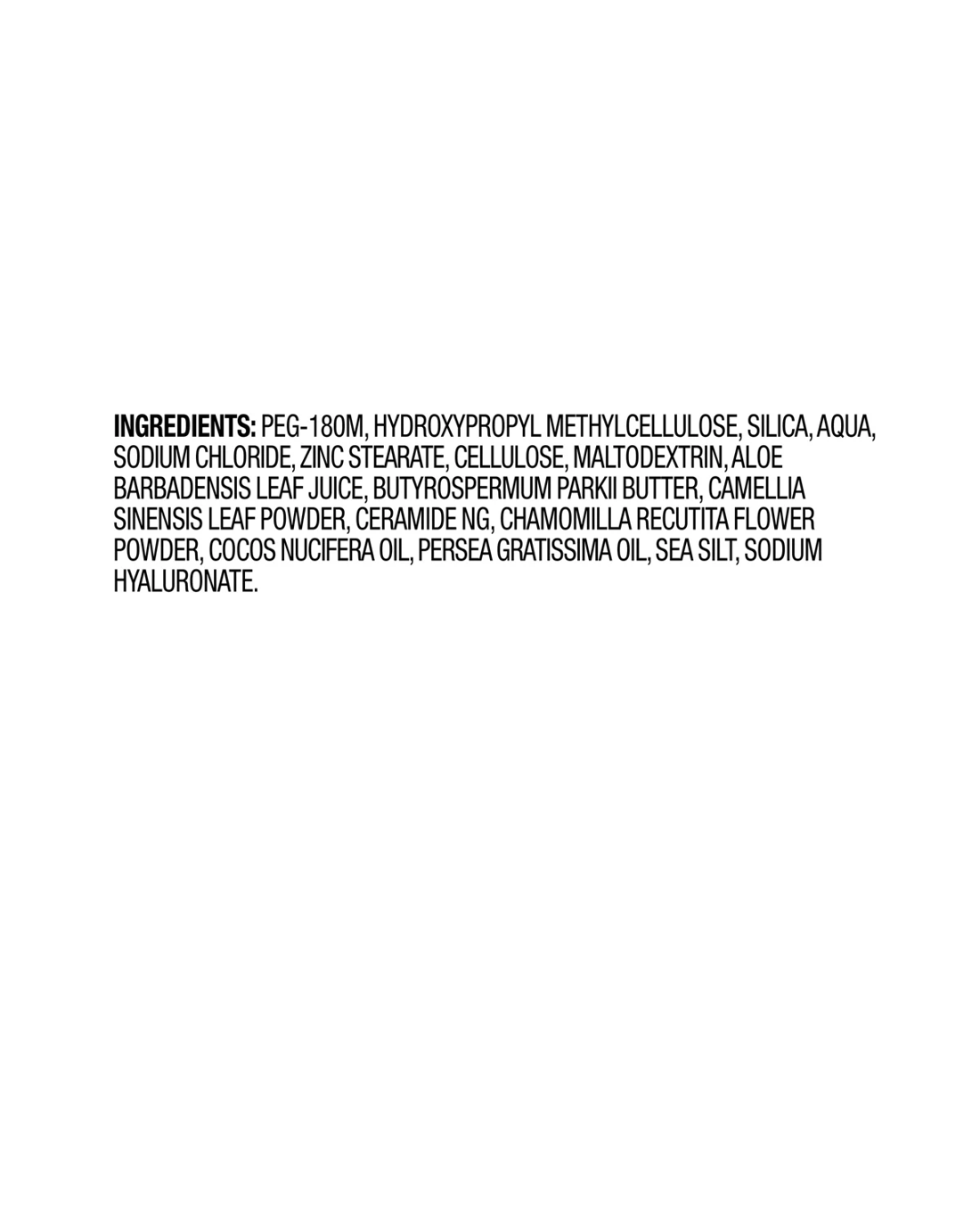 • Ingredients: Peg-180m, Hydroxypropyl Methylcellulose, Silica [Nano], Aqua, Sodium Chloride, Zinc Stearate, Cellulose, Maltodextrin, Aloe Barbadensis Leaf Juice, Butyrospermum Parkii Butter, Camellia Sinensis Leaf Powder, Ceramide Ng, Chamomilla Recutita Flower Powder, Cocos Nucifera Oil, Persea Grattissima Oil, Sea Silt, Sodium Hyaluronate