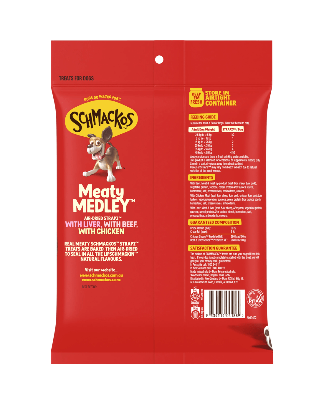 Schmackos branded products include an irresistible range of dog treats that are perfect for playing, training, rewarding and occupying our furry friends. Because these treats are specifically designed to smell and taste absolutely amazing...to a dog. Dogs Go Wacko for Schmackos. The Schmackos brand philosophy is to help dogs and their humans have more fun together. As soon as Schmackos treats are taken out of the cupboard, fun follows. And that's the way it should be. Strapz Treats are baked and then air-dried to seal in the delicious flavour of real meat.