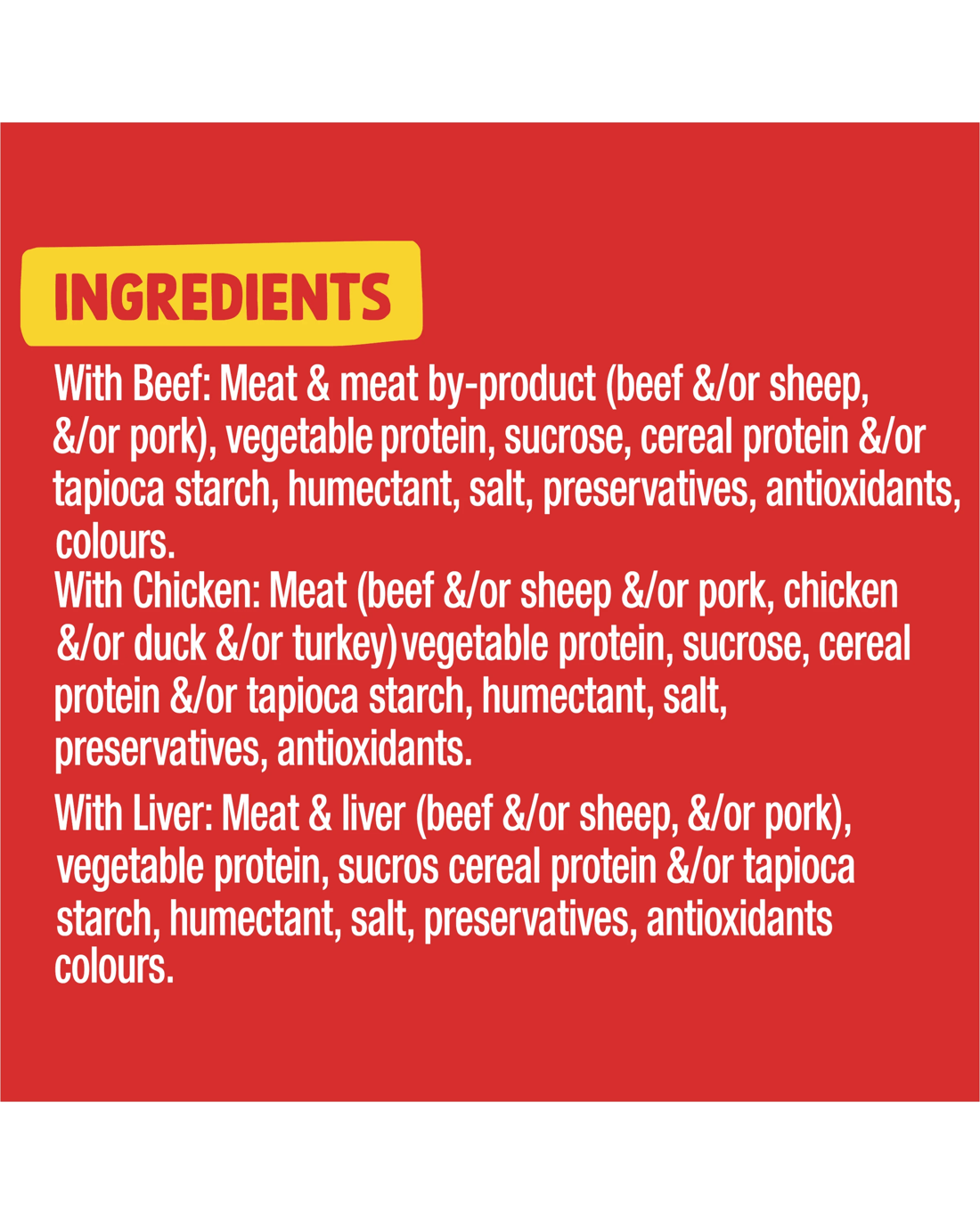 - With Liver: Meat & Liver (Beef &/or Sheep &/or Pork), Vegetable Protein, Sucrose, Cereal Protein &/or Tapioca Starch, Humectant, Salt, Preservatives, Antioxidants, Colours